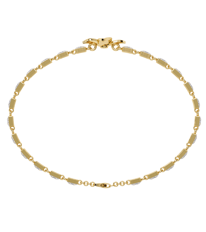 - Setting: warm gold-tone metal paired with square-cut diamond stations along the bracelet.