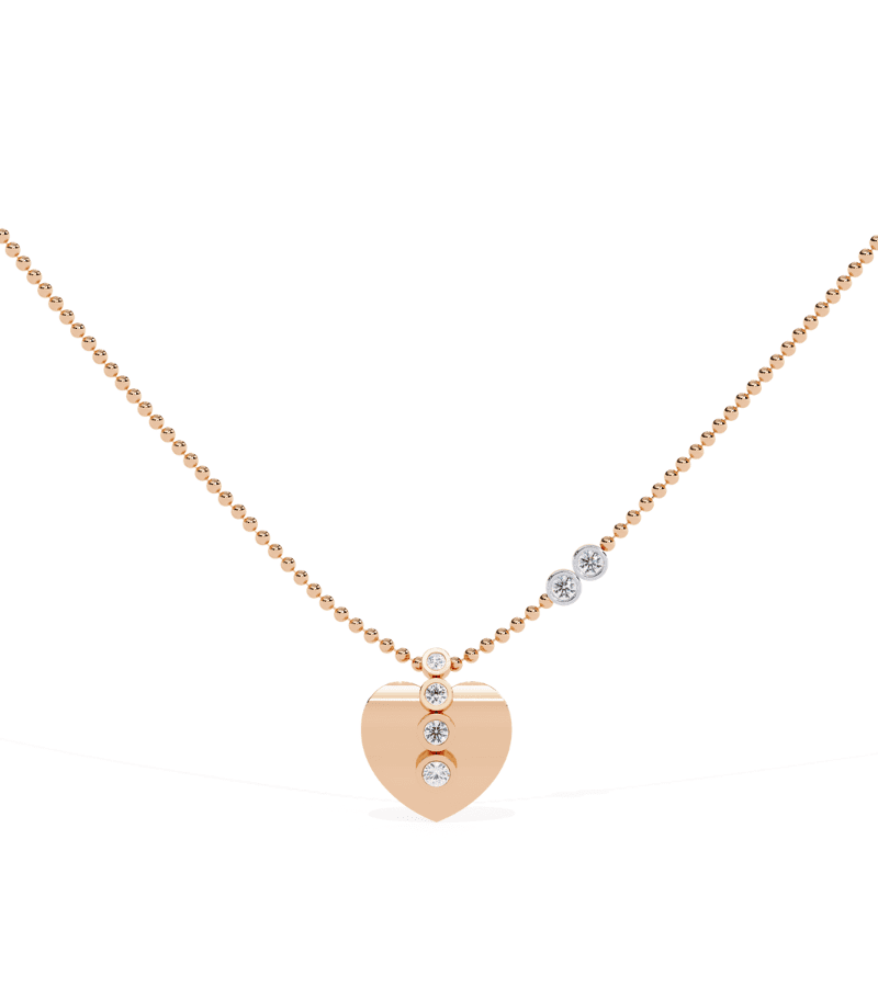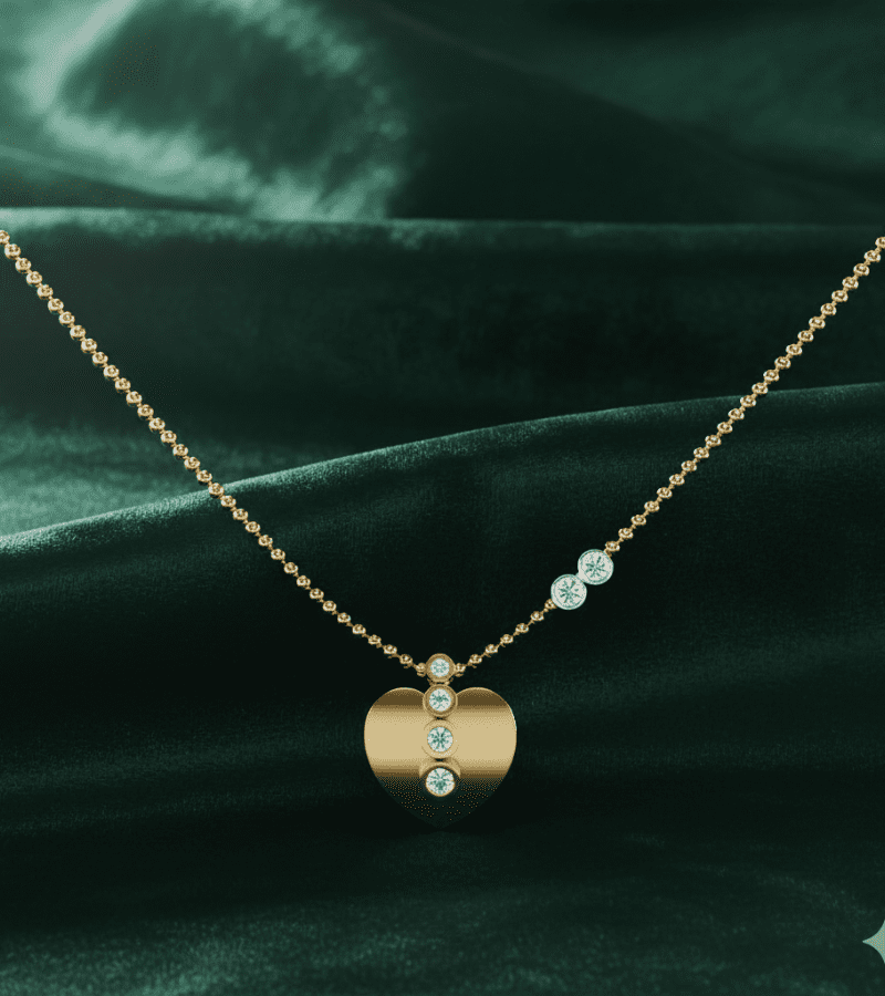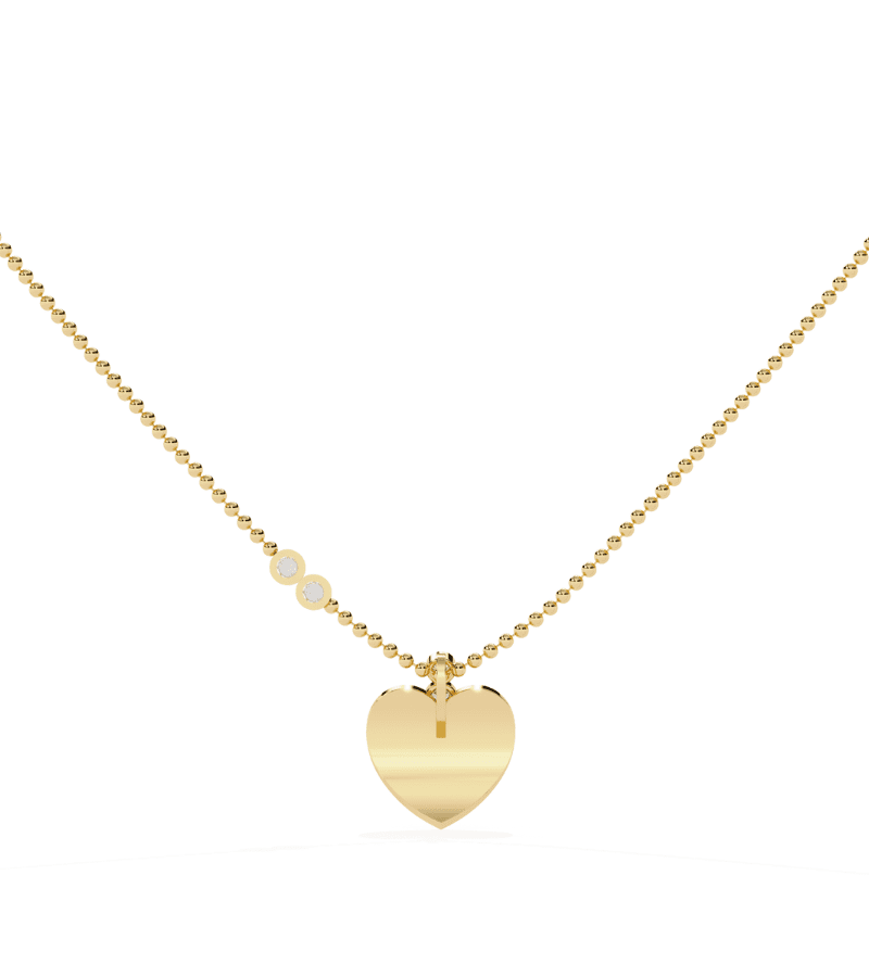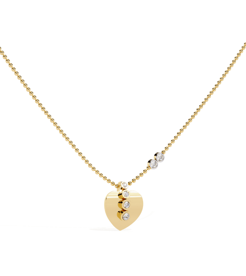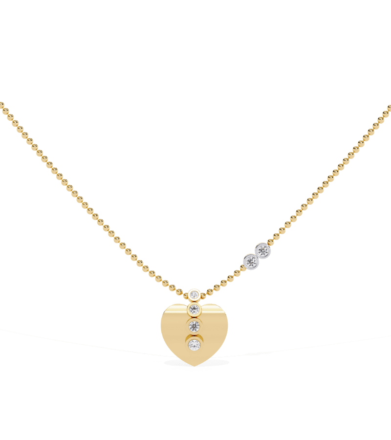 Gold-tone heart pendant with a vertical row of pavé diamonds running along the front, suspended from a beaded gold chain.- Design: heart-shaped pendant featuring a vertical line of diamonds embedded in the front.