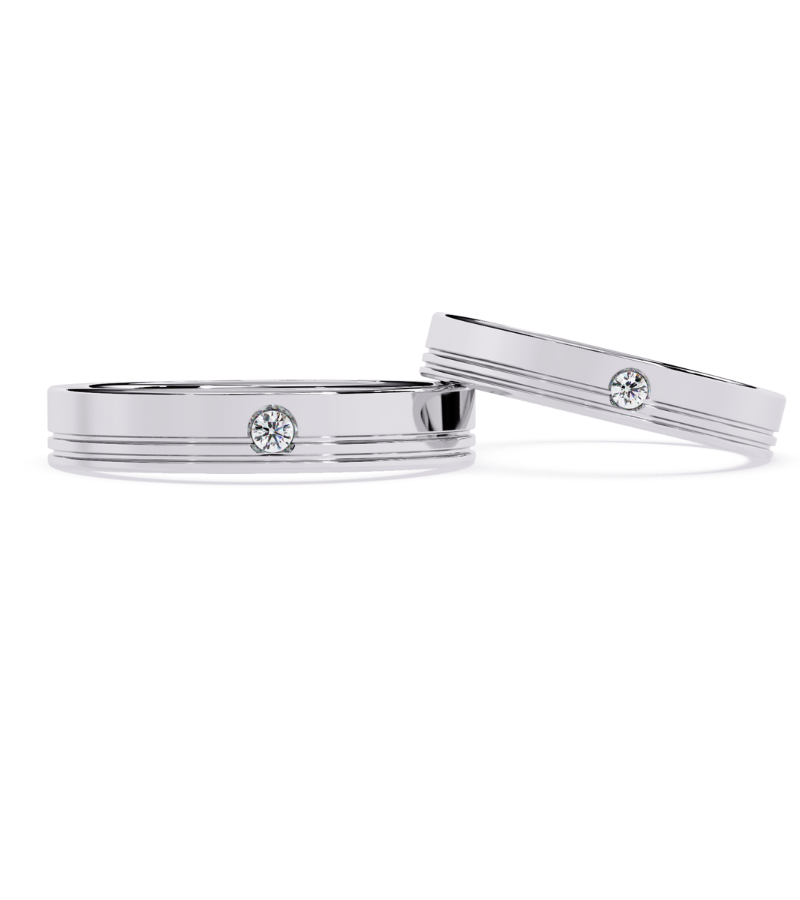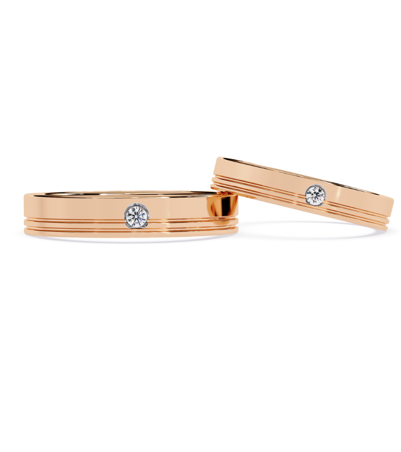 These matching bands present a sophisticated pairing in warm gold-tone metal, each ring hosting a solitary brilliant diamond centered amid understated double grooves. The clean, geometric lines and symmetrical layout offer a modern, couture-inspired look that pairs beautifully for weddings, anniversaries, or chic everyday wear. Finished with a high-polish sheen, they convey timeless romance with contemporary polish.