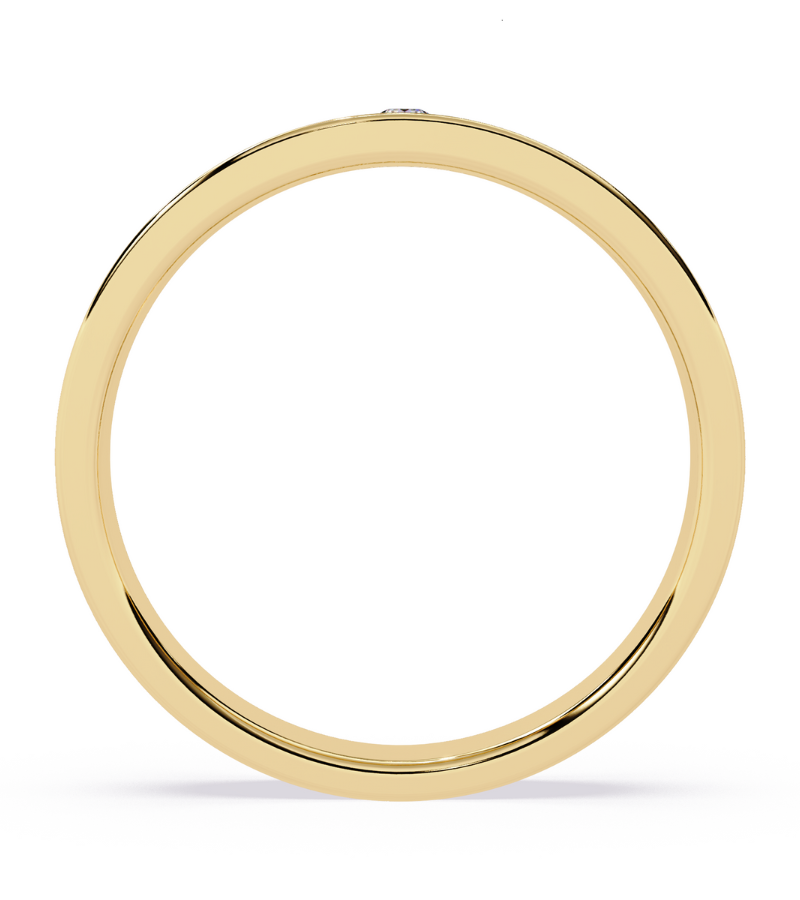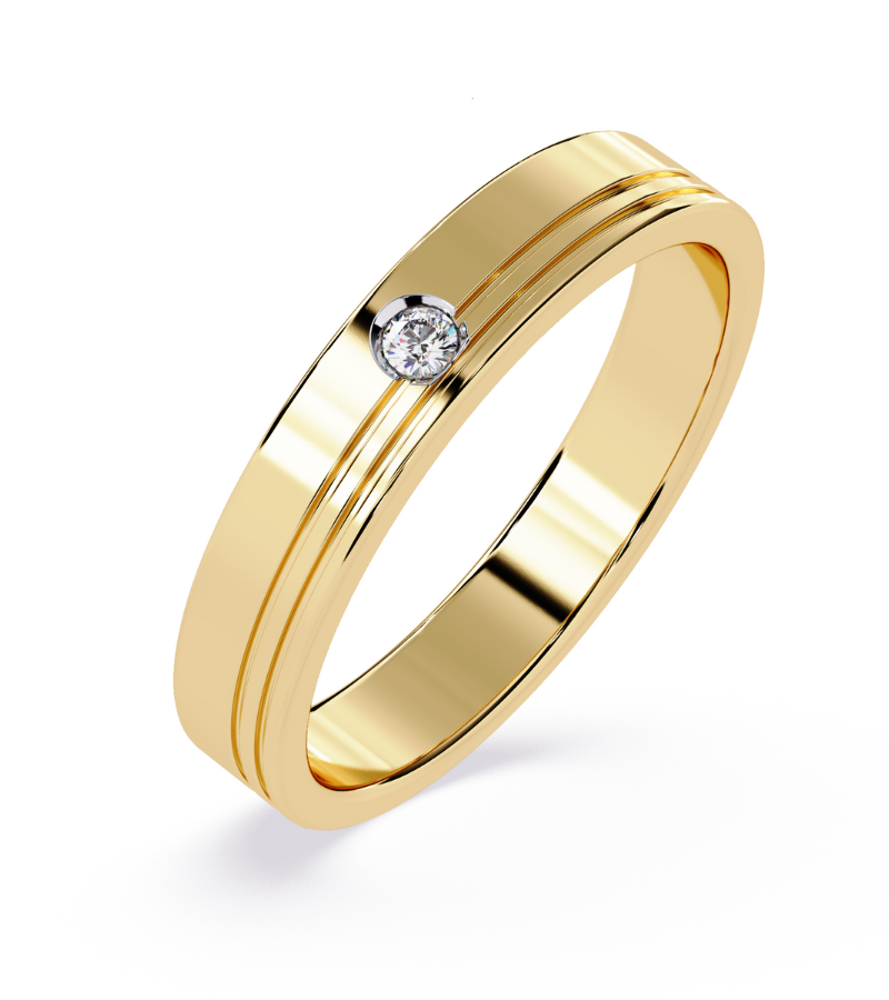 - Setting: prong-set diamonds on a polished gold band with delicate groove accents.