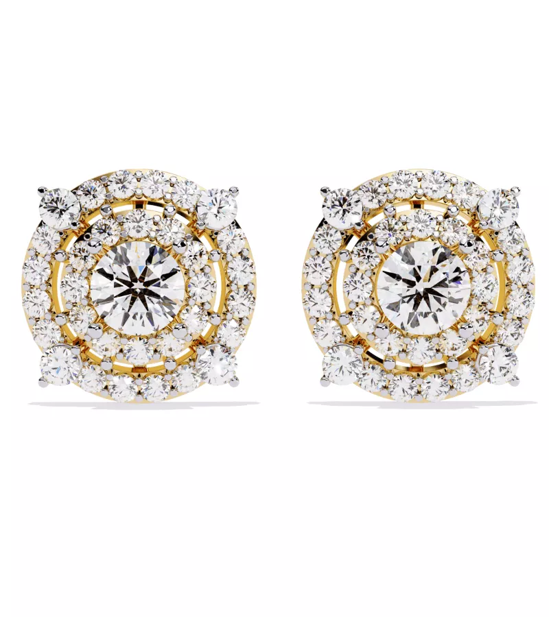 Haloed Brilliance Diamond Cluster Earrings showcase a dramatic, multi-tiered halo design. A central round diamond sits at the heart, encircled by inner and outer pavé halos that crown the piece with abundant fire. The warm gold-tone metal provides rich contrast, enhancing the sparkle from every facet and delivering a balanced blend of vintage elegance and contemporary opulence. Perfect for gala moments, weddings, or upscale evenings, these earrings offer enduring refinement and statement-worthy brilliance.