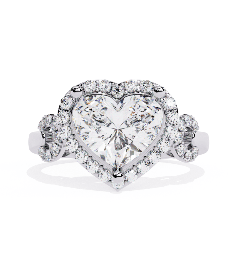 - Design: prominent heart-shaped center stone encircled by a two-tier pavé halo.