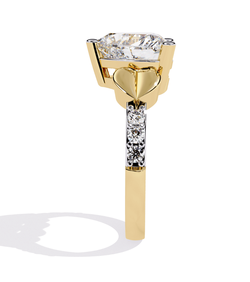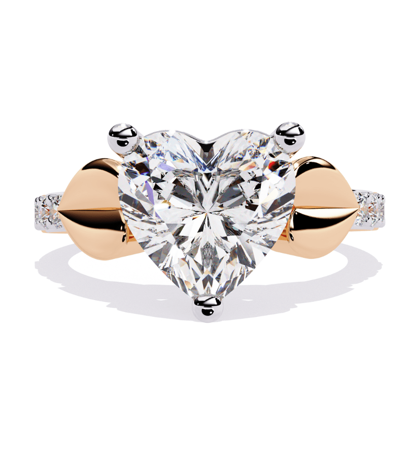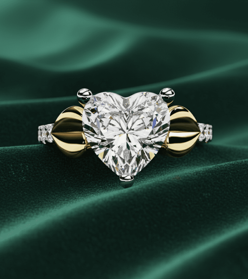 - Design: prominent heart-cut central diamond with gold-toned, sculpted side motifs.
