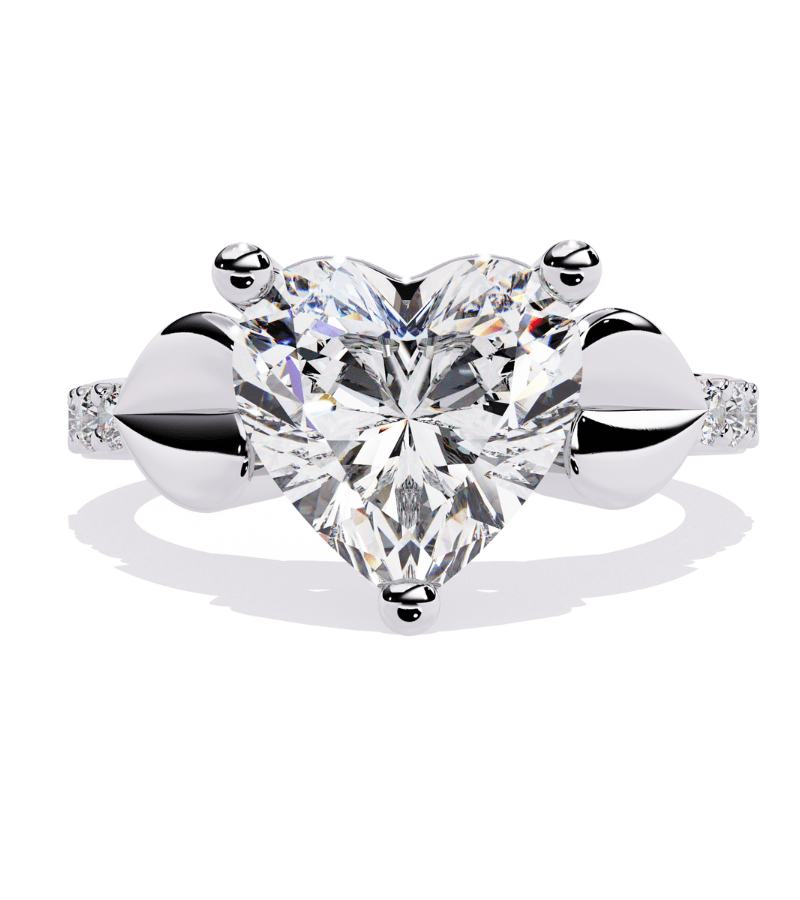Delicate ring featuring a large heart-cut diamond flanked by sculpted gold settings and pavé-accent shoulders.