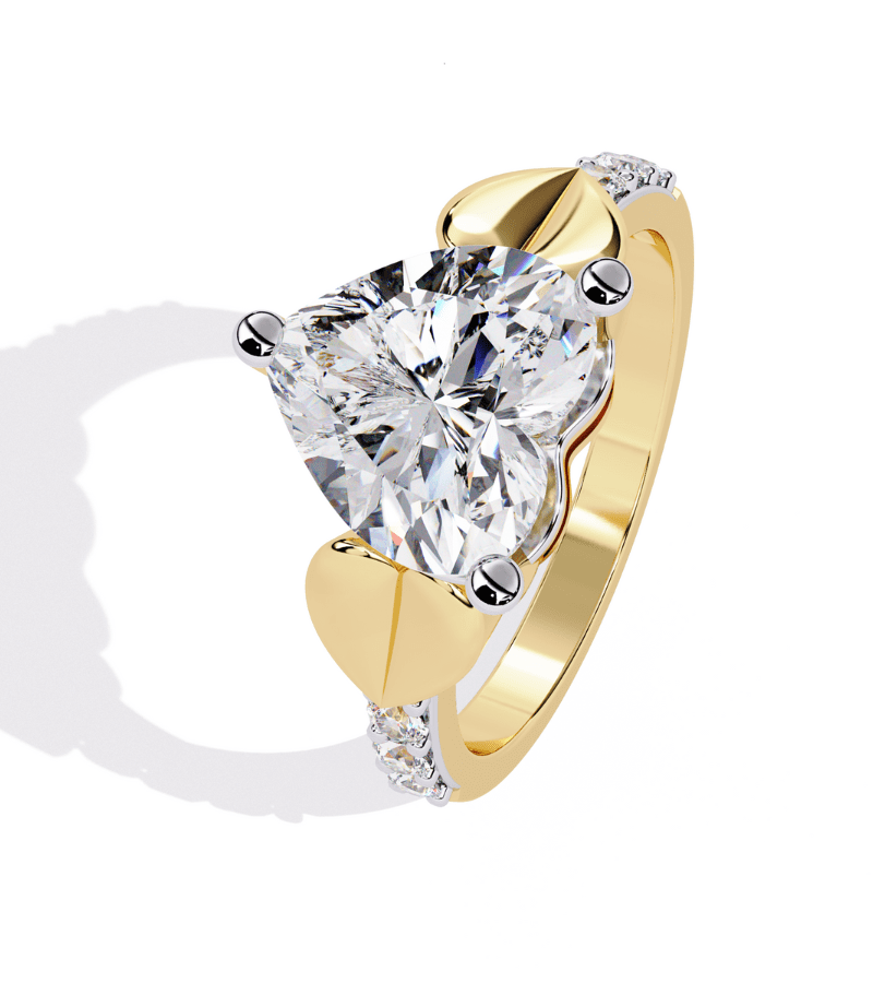 This ring centers a stunning heart-cut diamond framed by two glossy gold-toned accents that resemble abstract petals flanking the stone. The band features pavé diamonds along the shoulders, adding continuous sparkle from every angle. The combination of a bold heart-shaped centerpiece with warm, sculpted gold elements and a bright white-metal setting creates a piece that is both romantic and fashion-forward—perfect for engagements, anniversaries, or as a striking daily luxury.