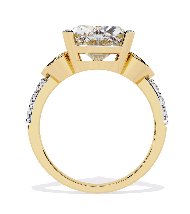- Setting: mixed metals (bright white-tone diamond setting with warm gold-tone accents) and pavé shoulders.