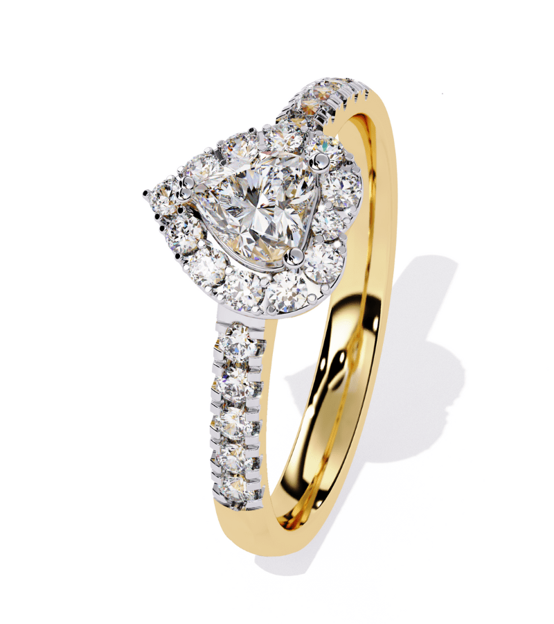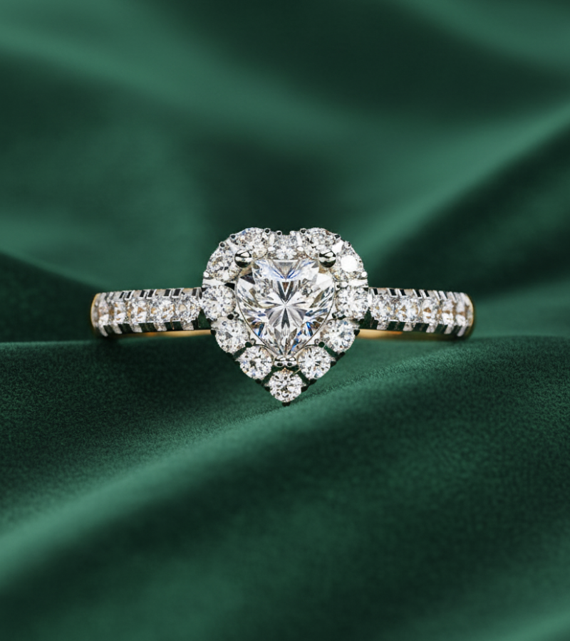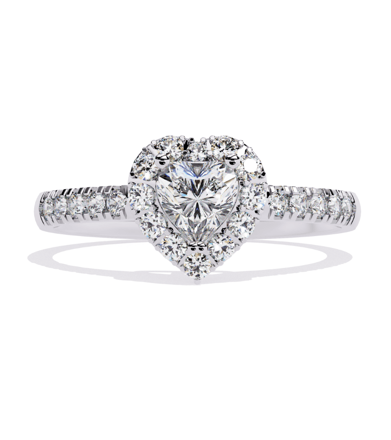 - Design: heart-shaped center stone framed by a double halo of brilliant pavé diamonds.