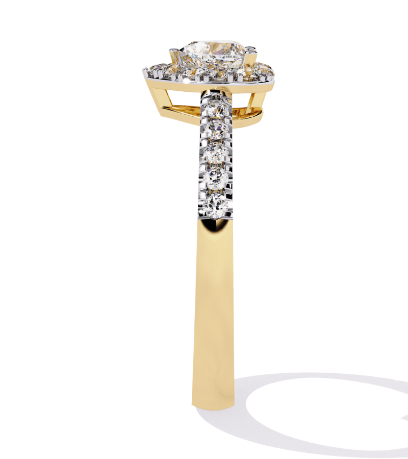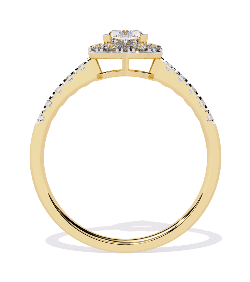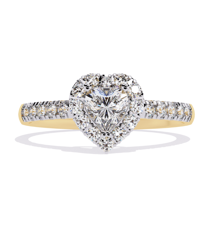 Elegant ring featuring a heart-shaped center diamond encircled by a halo of pavé diamonds, with a pavé-studded band.