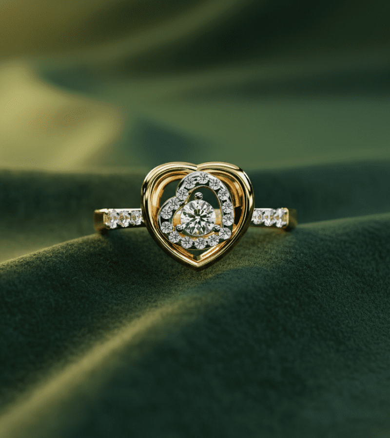 This ring centers a luminous heart motif in warm gold-tone metal. An open heart frame cradles a brilliant central diamond, which is surrounded by a refined pavé halo that enhances its sparkle. The shoulders are pavé-set, extending the twinkle along the band and adding balance to the romantic centerpiece. The result is a sophisticated blend of classic romance and contemporary detailing, making it ideal for engagements, anniversaries, or as a lasting expression of love with everyday luxury.