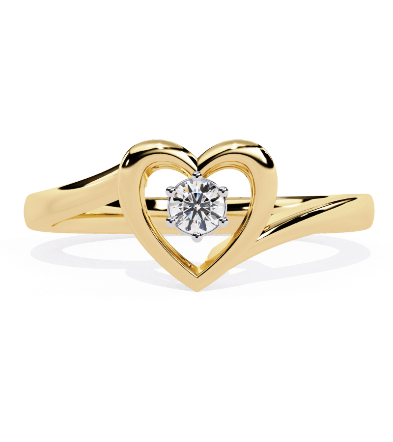 This ring features a graceful open-heart silhouette crafted in warm gold-tone metal, with a split band that converges to cradle a radiant round diamond at its center. The solitaire diamond becomes the focal point, catching light from every angle as the heart-shaped frame adds a romantic, feminine touch. The smooth, polished band and balanced proportions offer comfortable wear while elevating both everyday ensembles and dressy outfits with a subtle, timeless charm.