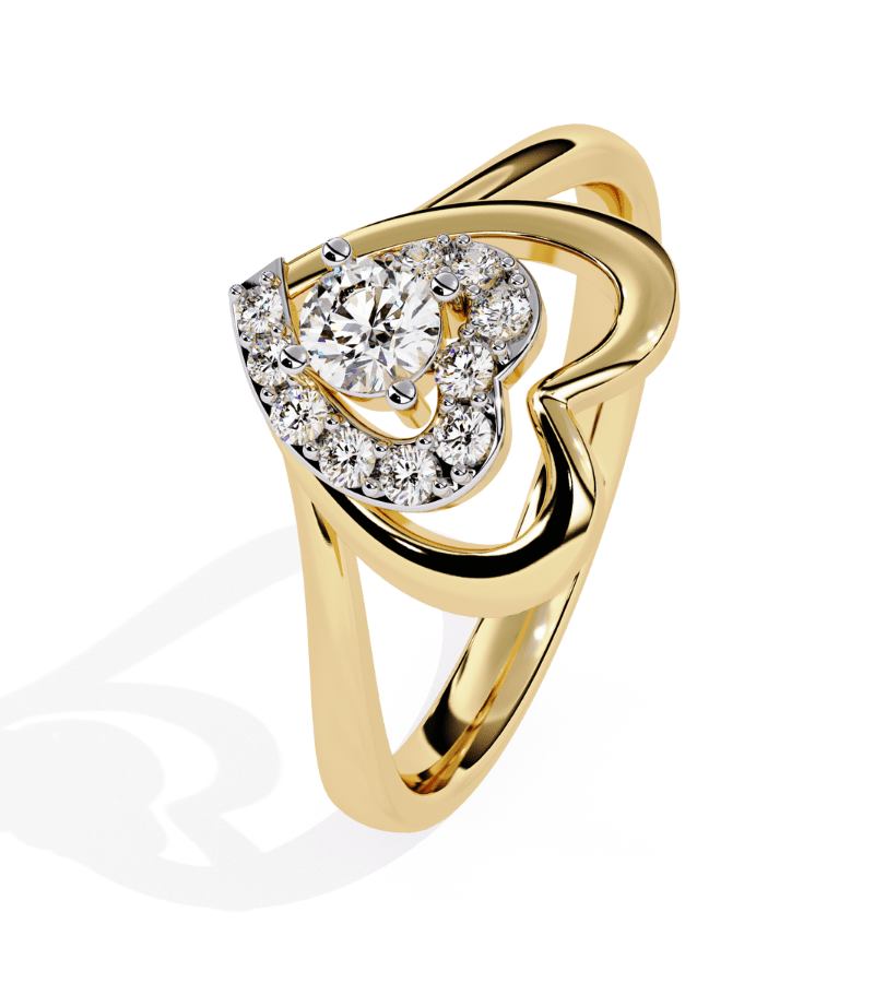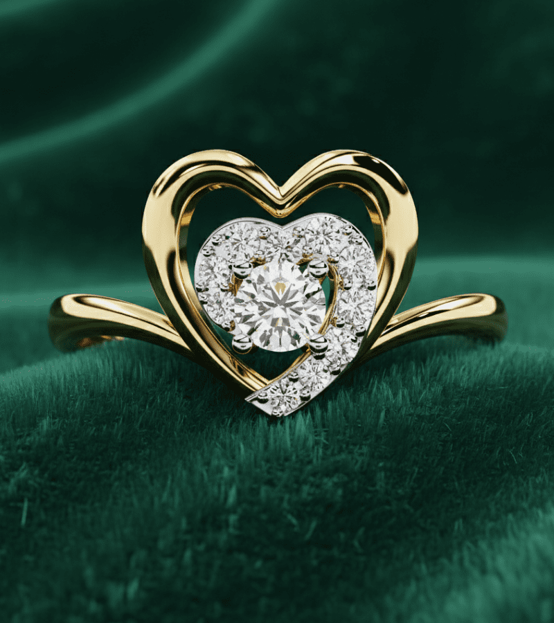 This ring presents a refined heart-inspired design in warm gold-tone metal. An open, sculpted heart frames a brilliant center diamond, edged by a pavé of smaller diamonds that contours the inner heart. The result is a luminous focal point with a delicate interplay between negative space and glittering stonework, evoking both romance and modern sophistication. Perfect for engagements, anniversaries, or as a statement piece to elevate any evening ensemble.