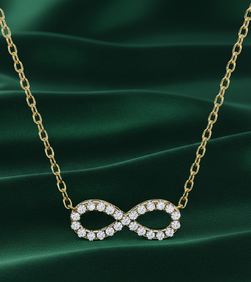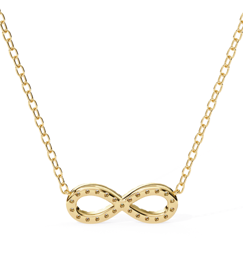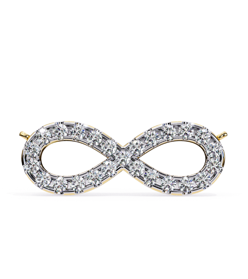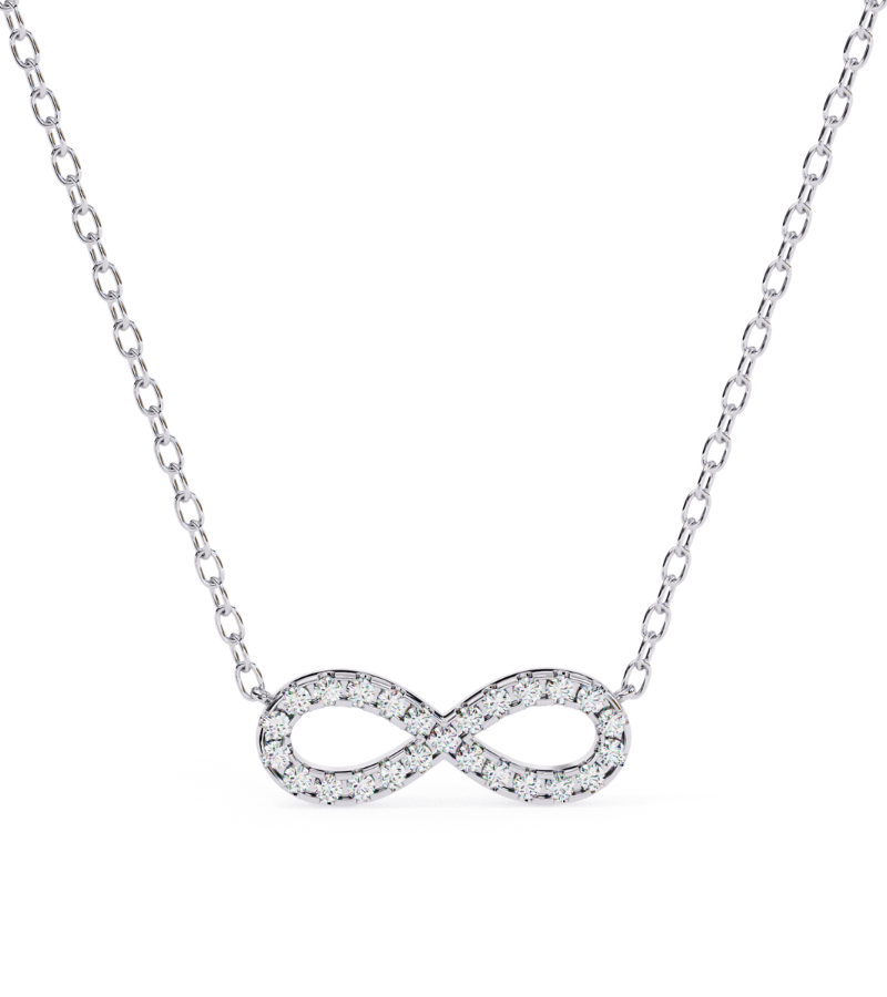 - Design: continuous loop infinity symbol outlined with evenly set pavé diamonds.