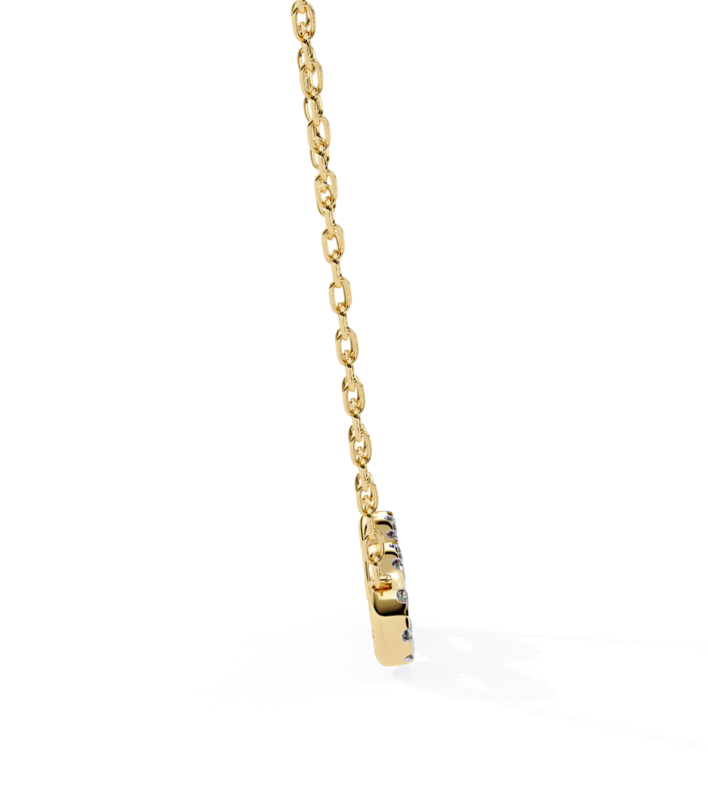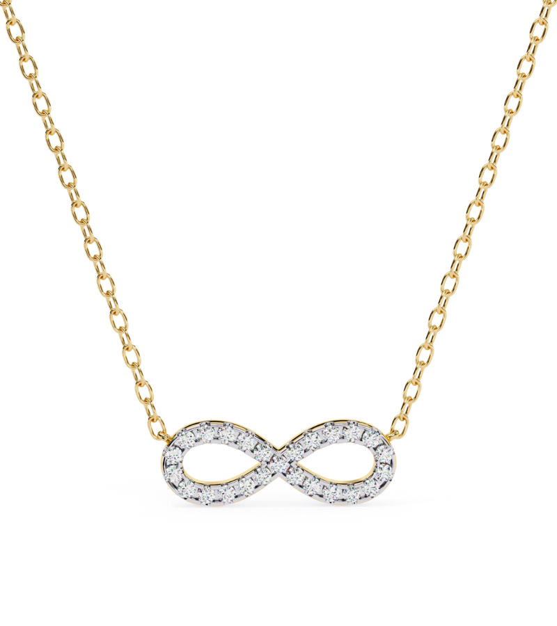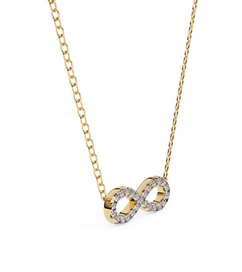 This pendant features a graceful infinity symbol crafted in warm gold-tone metal and lavishly encrusted with pavé-set diamonds along its entire looping form. The continuous, sparkling curve catches light from multiple angles, creating a radiant display of brilliance. Suspended from a slender gold chain, the pendant rests gracefully at the collarbone, offering a sophisticated statement of enduring style and refined glamour suitable for daily wear or dressier events.