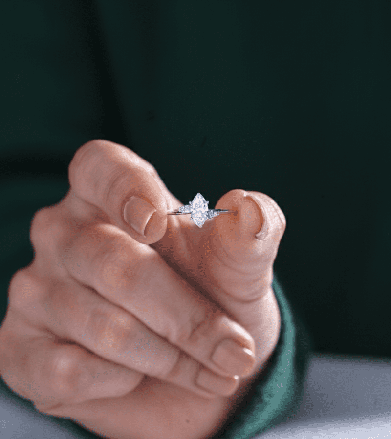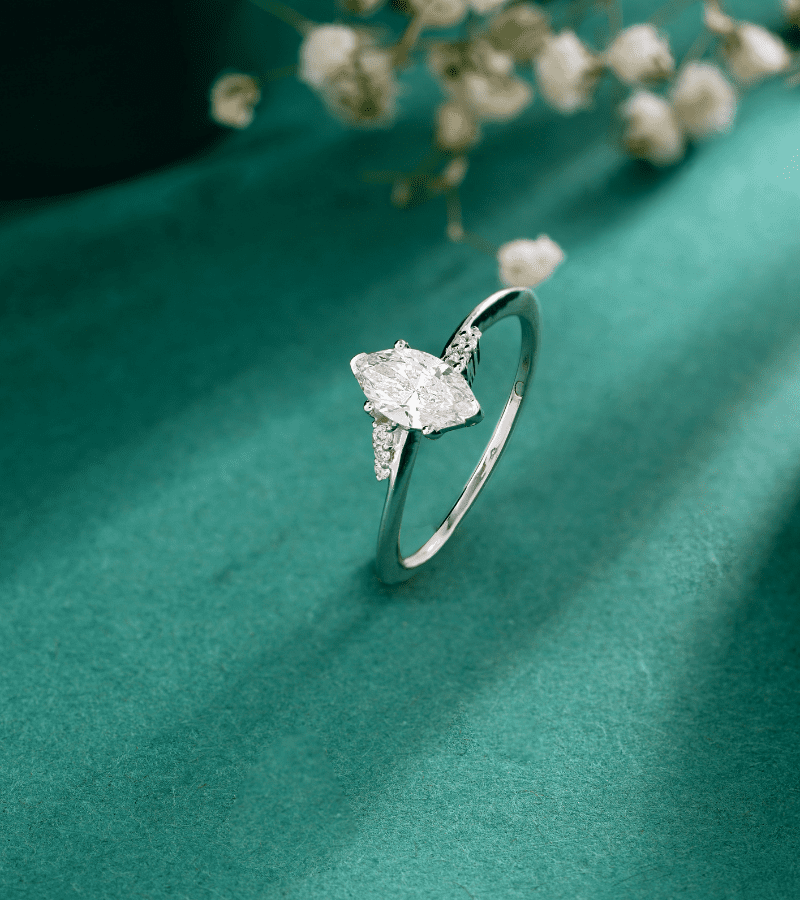 Sterling-silver ring with a marquise-cut center diamond flanked by delicate petal-inspired accents.- Design: slender band that curves into a graceful marquise centerpiece.