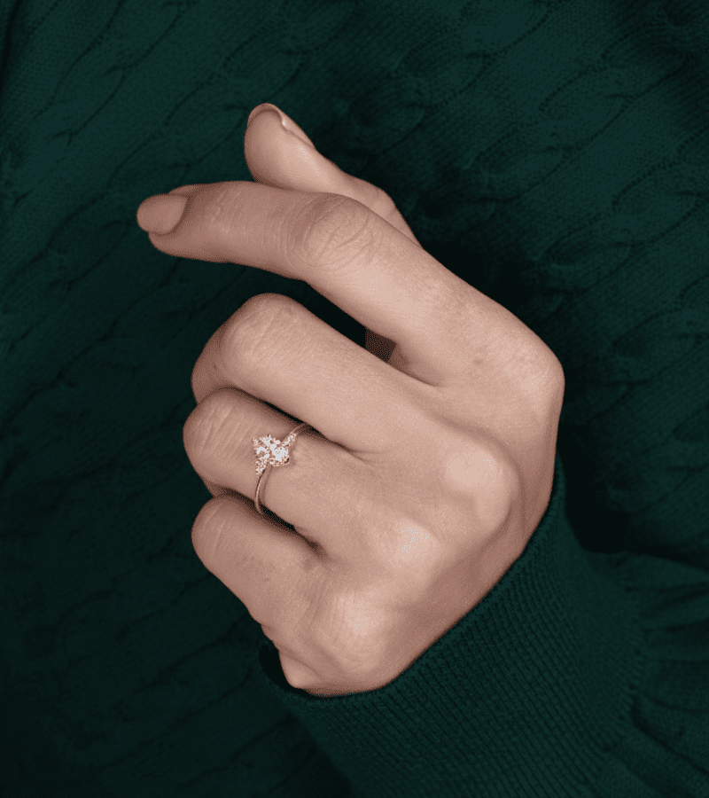 - Design: slender band that curves into a graceful marquise centerpiece.
