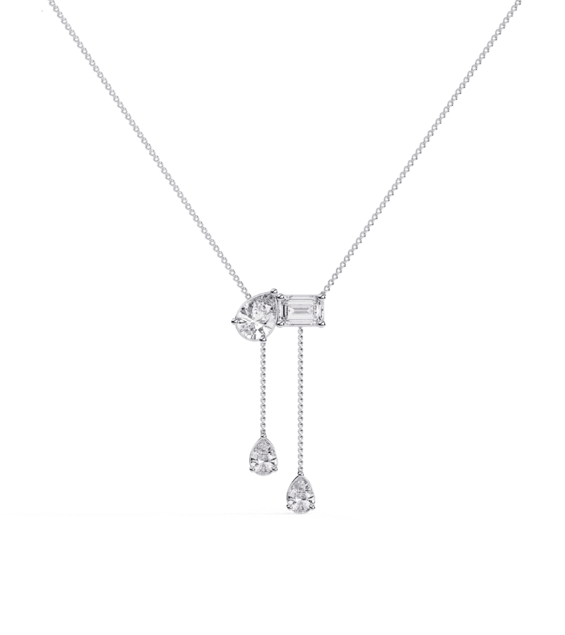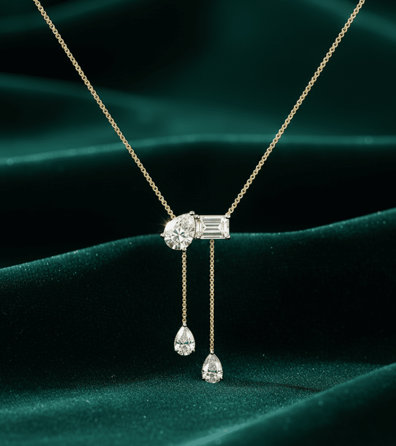 - Design: elegant Y-shaped pendant with a central round diamond, baguette-style bar, and twin dangles.