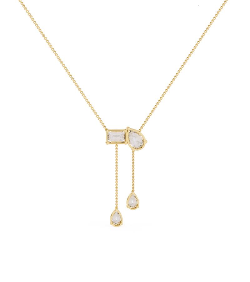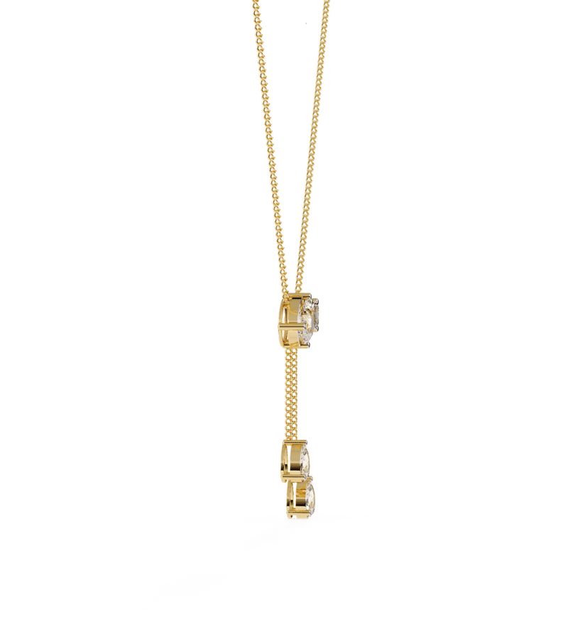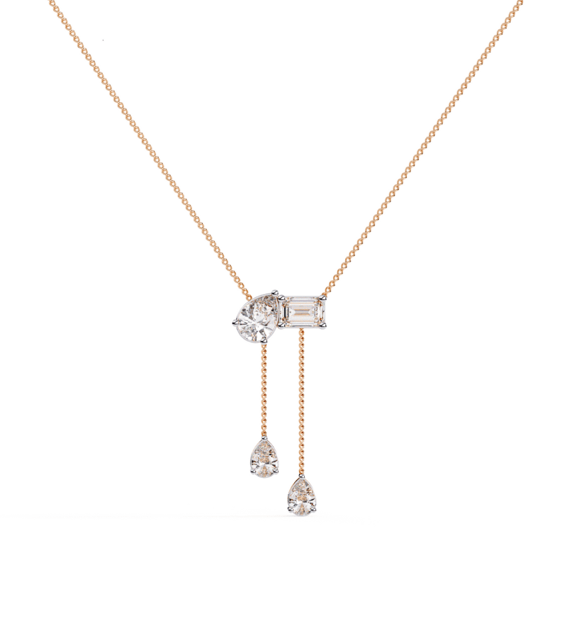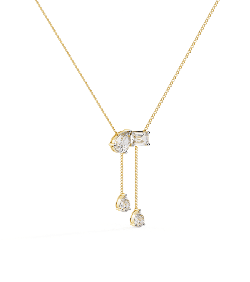 This necklace pairs a delicate gold-tone chain with a refined pendant that forms a subtle Y-shape. A round brilliant diamond sits at the top, followed by a slender baguette-bar accent, with two fine chains cascading downward to terminate in pear-cut diamond drops. The composition blends classic sparkle with contemporary geometry, allowing light to travel through each facet for maximum brilliance. The warm gold-tone setting enhances the stones’ clarity against a lush backdrop, making this piece perfect for gala nights, weddings, or elevated day-to-evening wear.