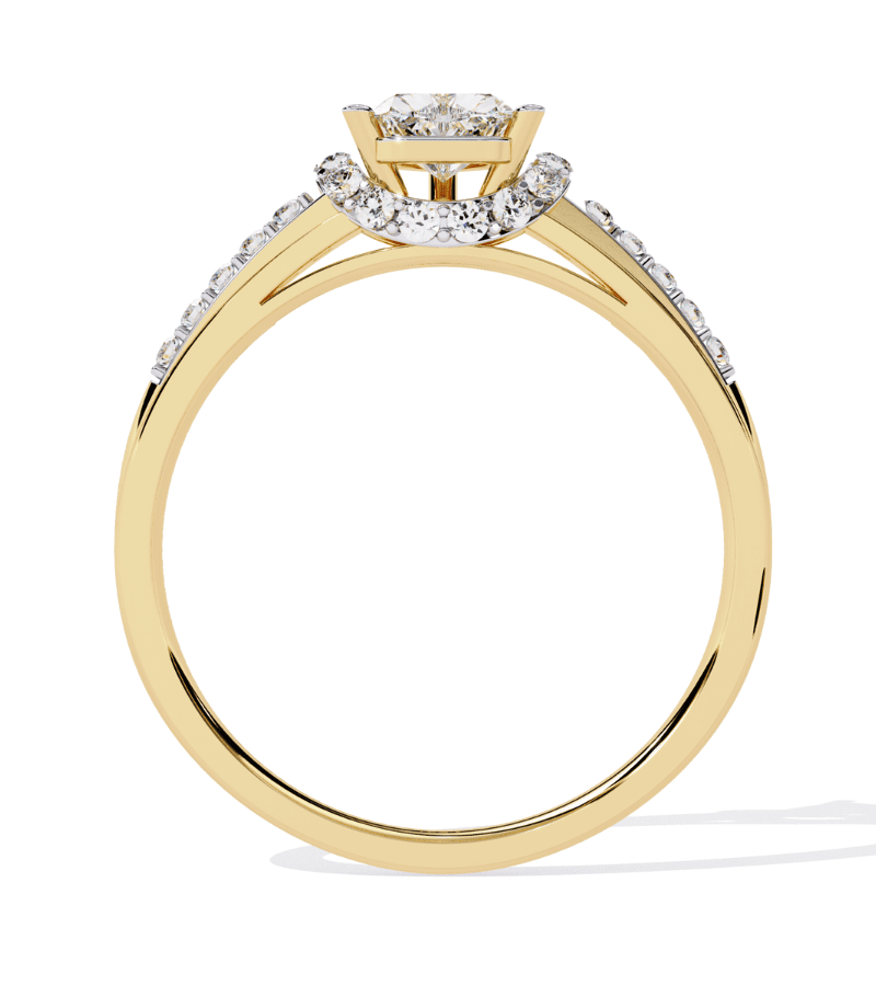 This ring presents a striking pear-cut center diamond surrounded by a shimmering halo of pavé diamonds, all set in a rich gold-tone band. The split shank is also pavé-set, creating continuous sparkle from finger to centerpiece. The combination of the radiant central stone, the halo, and the luminous band gives the piece a regal, celestial feel that captures light from every angle. Designed for formal events or a luxe everyday look, this ring delivers timeless glamour with modern poise.