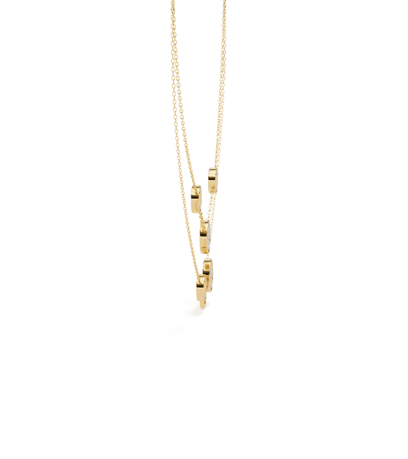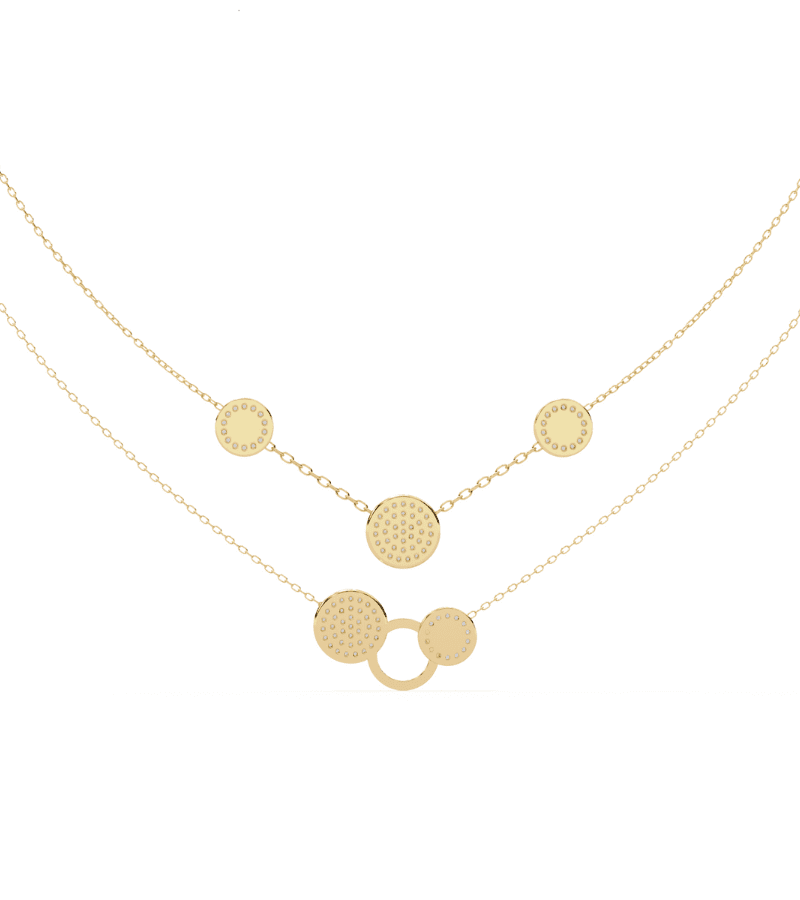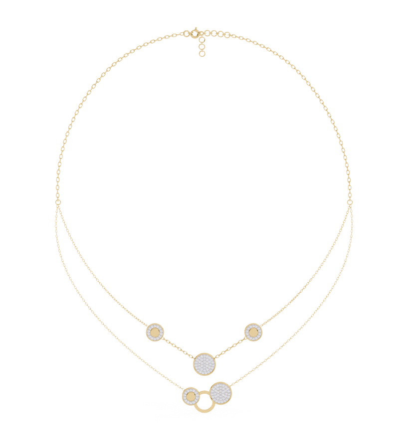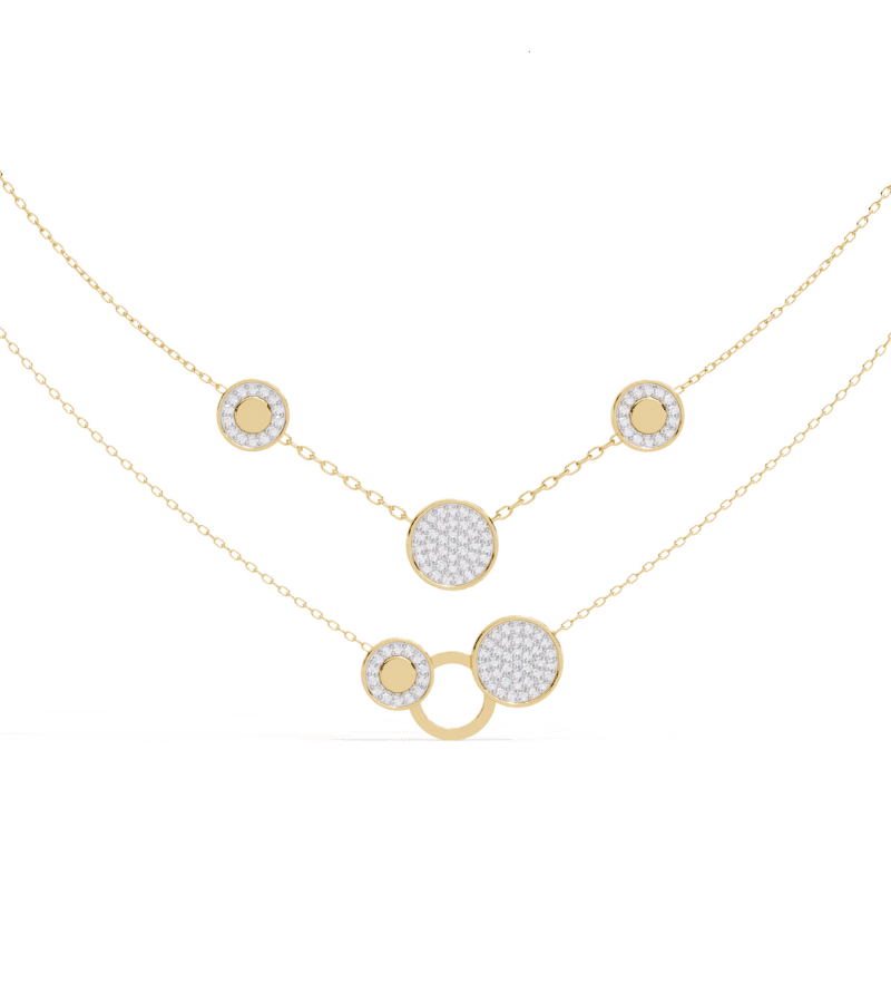 This necklace features a graceful, multi-layered design in warm gold-tone metal. The upper two shorter chains showcase pavé-diamond discs of varying sizes, aligned along a delicate link, while the longest chain carries a slightly larger central disc. A small crescent-ring charm sits at the base, adding a whimsical, celestial touch that completes the ensemble. The combined layers create a luminous, cascading effect that sits beautifully at the collarbone, making it ideal for everyday elegance or special occasions. Thoughtful, feminine, and refined, it makes a standout gift or a luxurious addition to any jewelry collection.