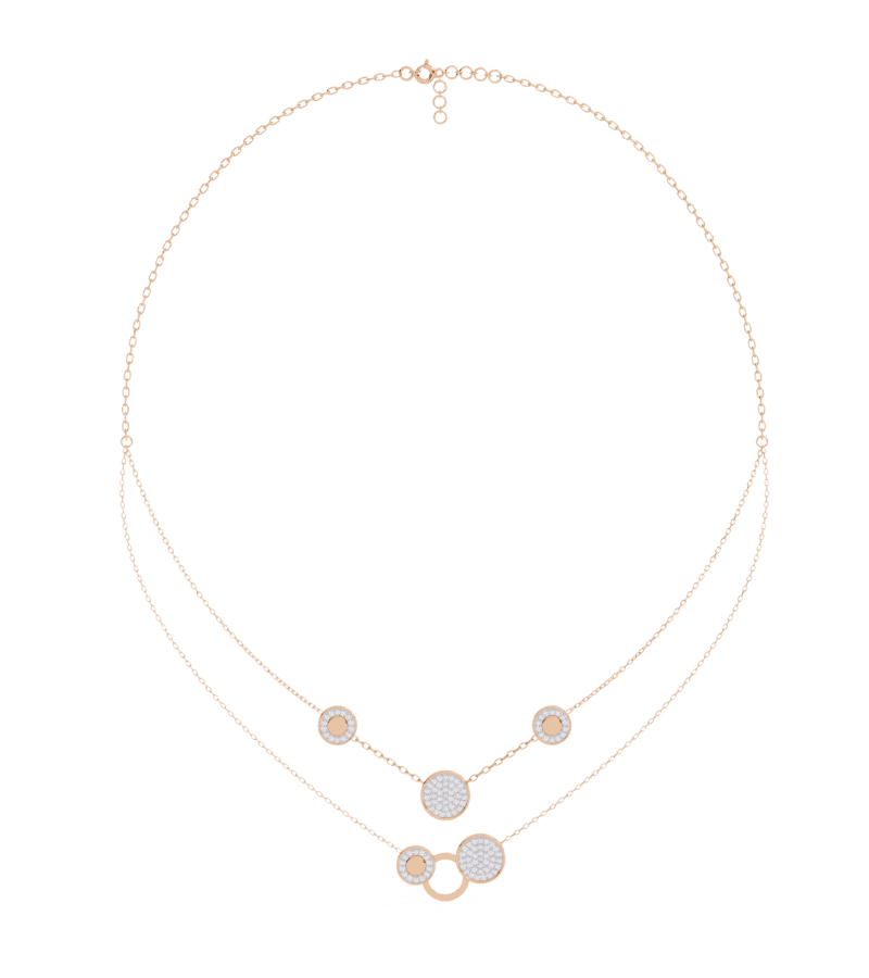 - Design: three-tiered layers with circular pavé discs connected along fine chains.
