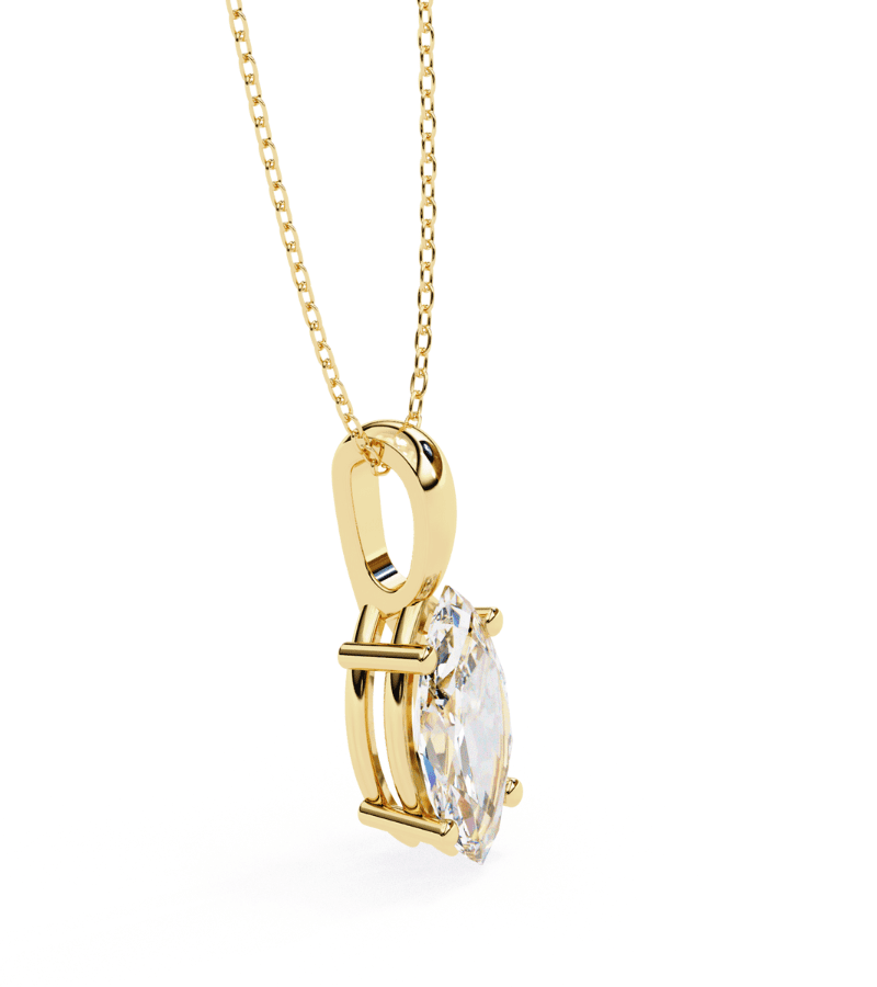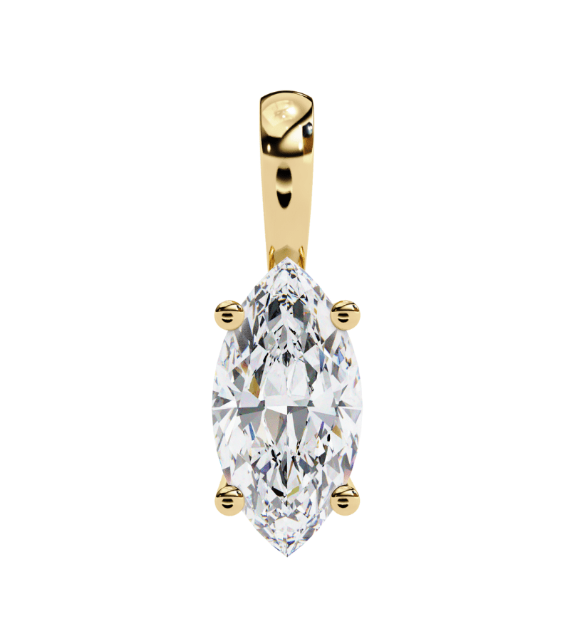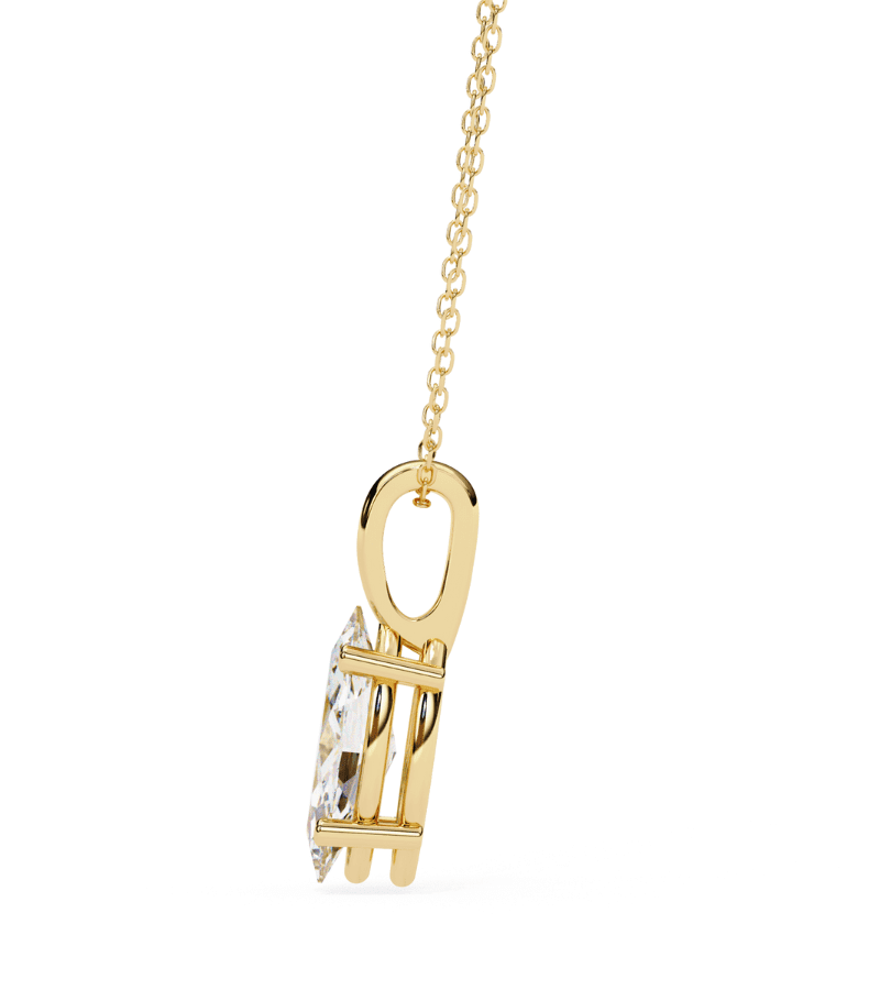 This pendant features a brilliant marquise-cut diamond held securely in a refined four-prong gold setting. The elongated, brilliant facets maximize light return, creating a dramatic, laser-cut sparkle. Suspended from a slender gold chain, the pendant rests gracefully at the collarbone, offering a sophisticated statement with a timeless, vintage-inspired silhouette. The warm gold-tone metal enhances the diamond’s brilliance, making it a versatile piece suitable for daily refinement or special-occasion glamour.