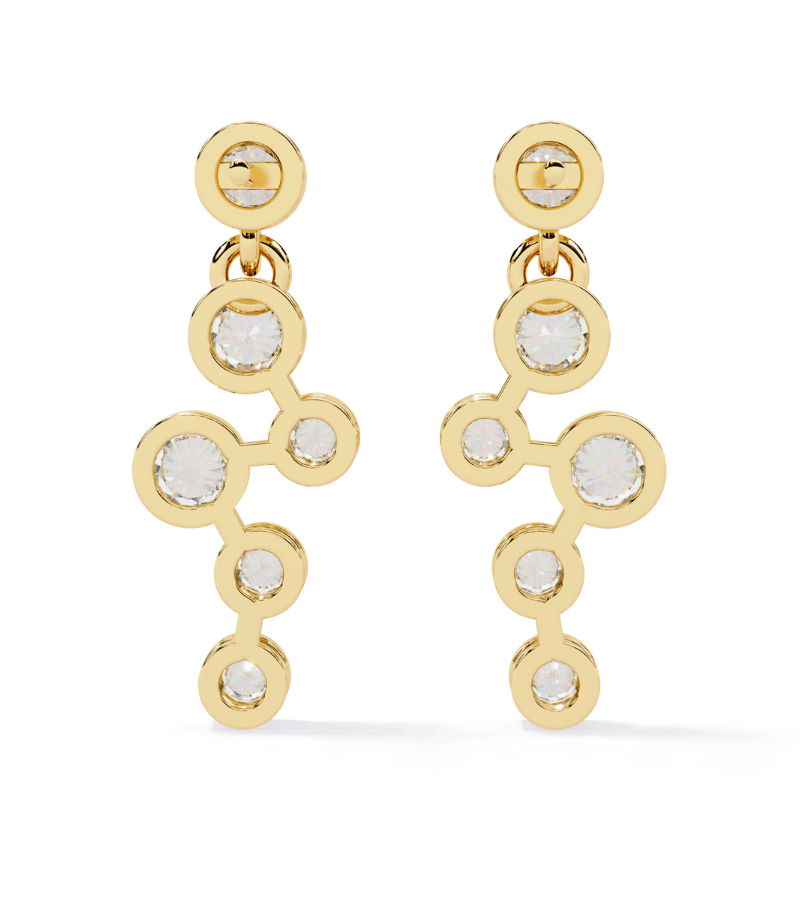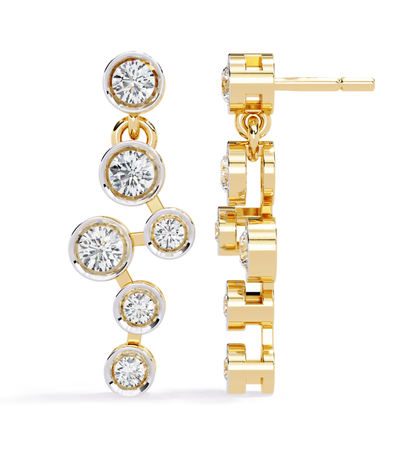 Gold-tone drop earrings with a cascading sequence of round diamonds set in bezel frames