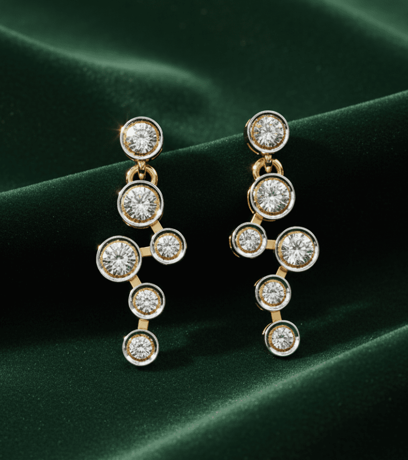 - Design: linked circular bezels creating a graceful stair-step silhouette.