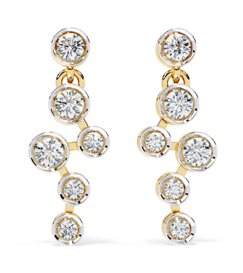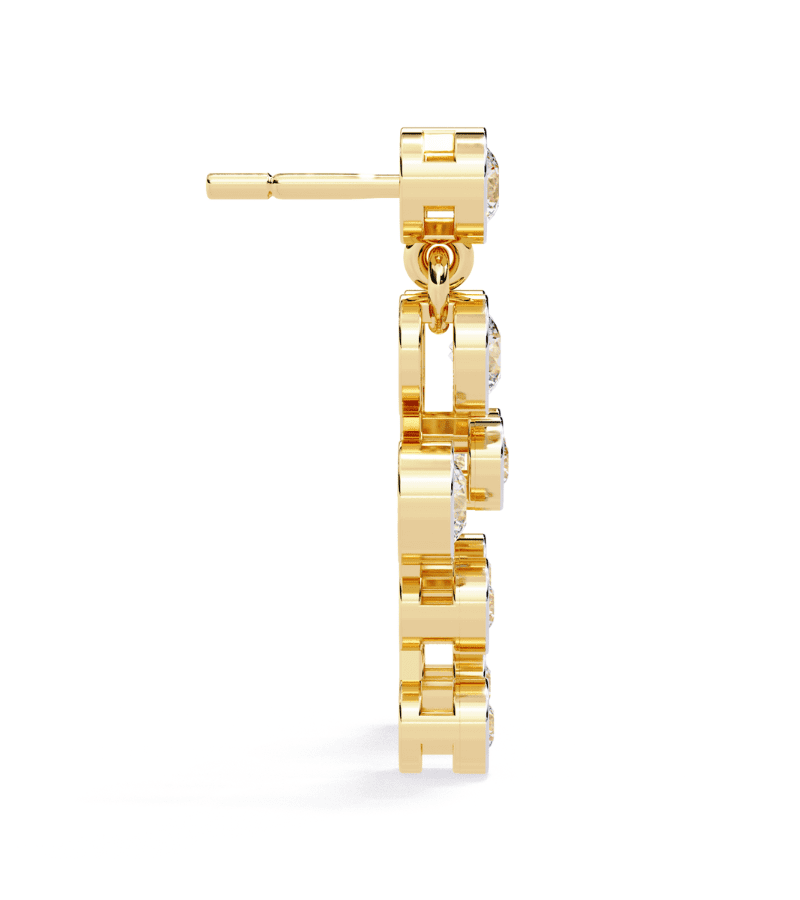 Gold-tone drop earrings with a cascading sequence of round diamonds set in bezel frames.- Design: linked circular bezels creating a graceful stair-step silhouette.
