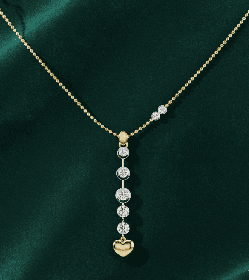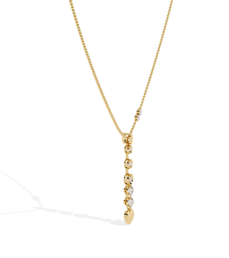 Gold-tone pendant featuring a vertical drop of round diamonds ending in a polished heart charm.- Design: cascading circle diamonds linked by polished settings, finishing with a gold heart charm.
