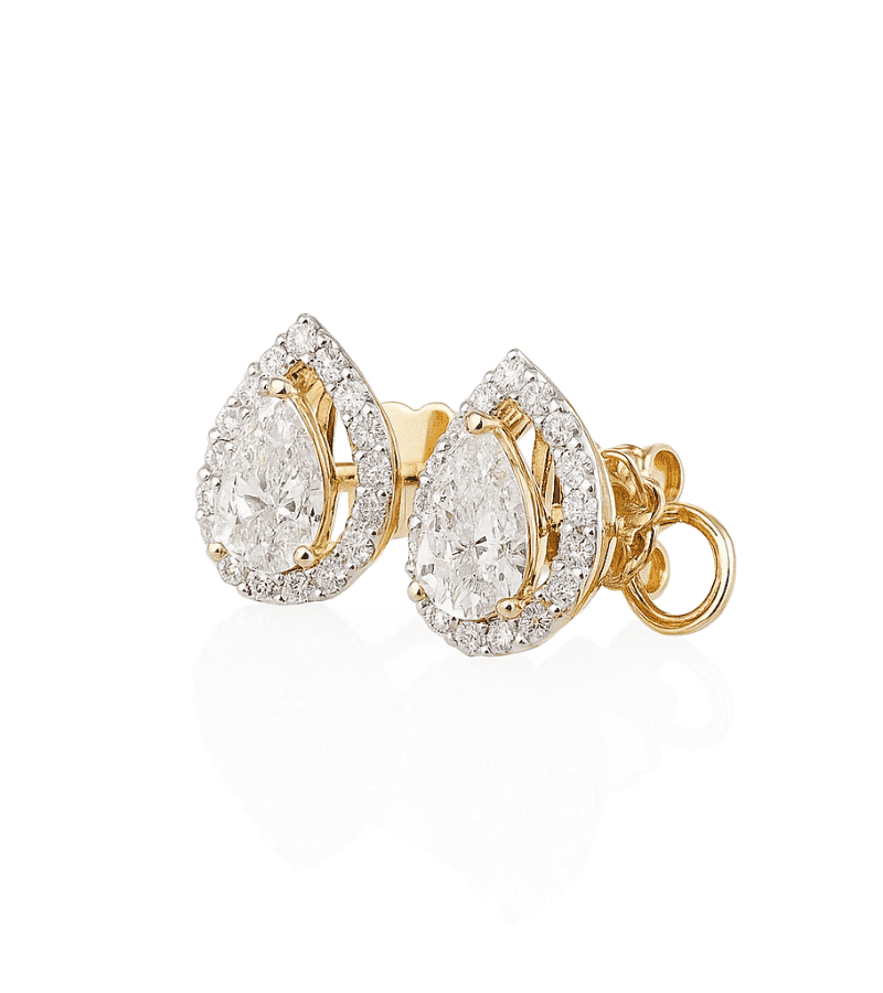 Gold-tone teardrop earrings with a central pear-shaped diamond surrounded by a halo of pavé diamonds on a slender drop setting.- Design: pear-cut center stone encircled by a double halo of pavé diamonds for maximum sparkle.