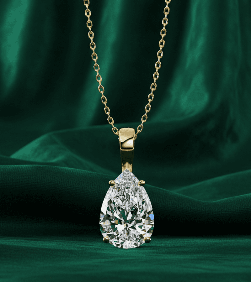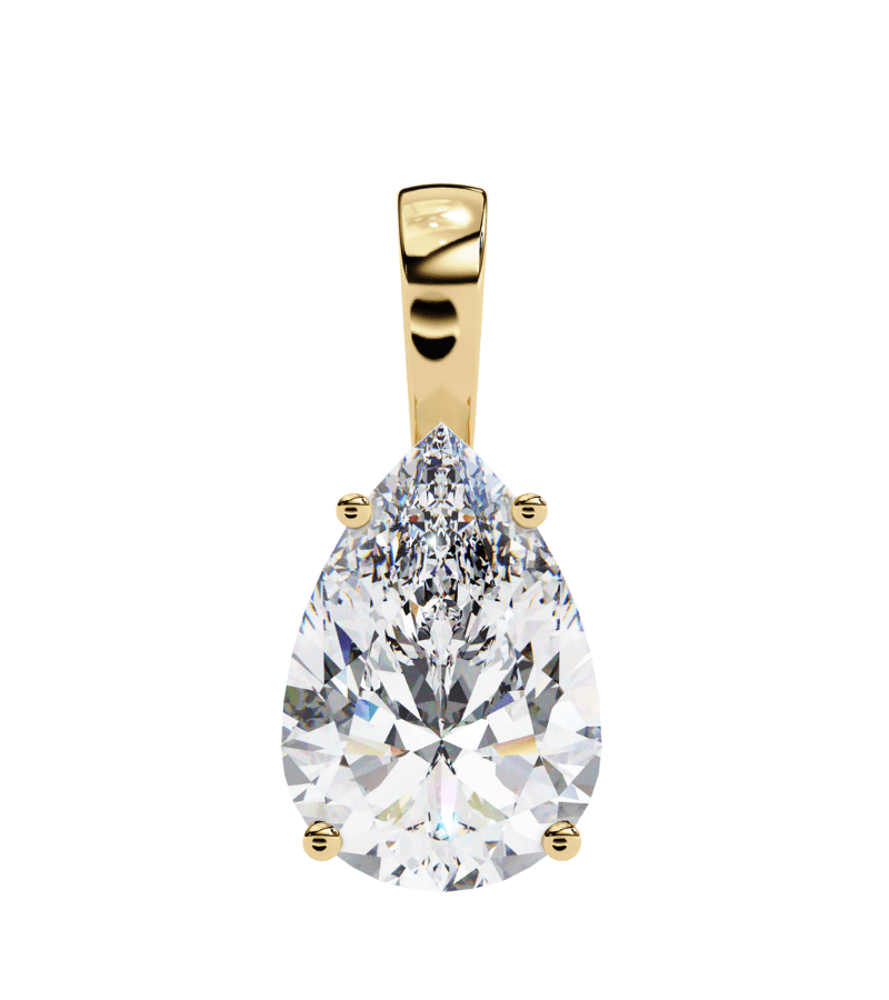 Gold-tone teardrop pendant with a large pear-cut diamond-style stone set in a classic four-prong bezel, suspended from a delicate gold chain.- Design: pear/teardrop-cut center stone in a secure four-prong bezel.