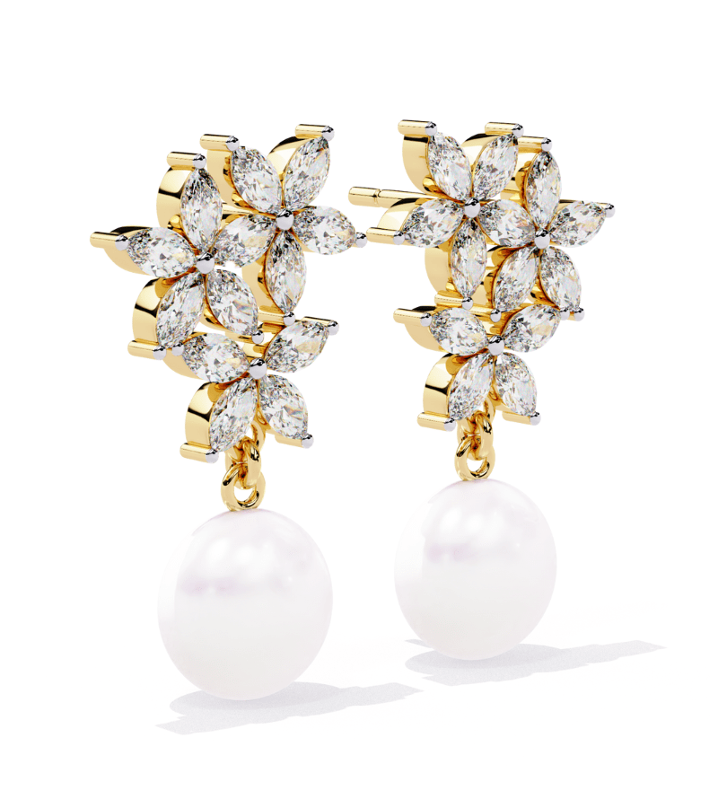 Elegant drop earrings featuring a cluster of marquise diamond petals arranged as a flower, with a single large pearl drop