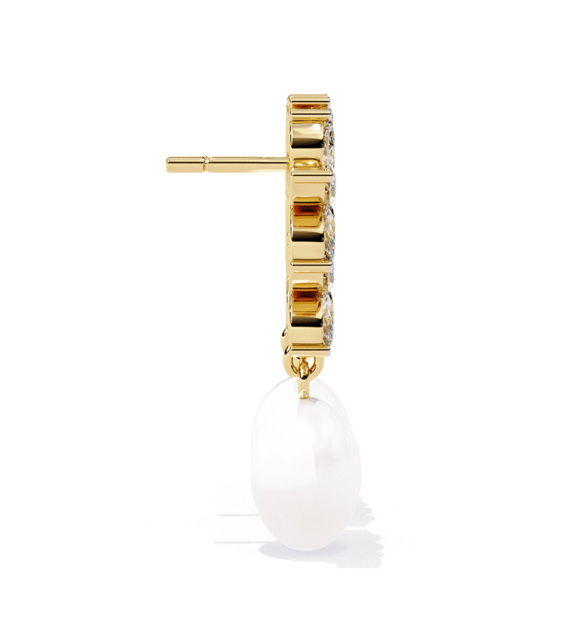 These Pearl Blossom Diamond Earrings showcase a refined floral motif where marquise-cut diamond petals form a radiant flower atop a lush gold framework. A lustrous, near-mm perfect pearl dangles beneath each blossom, adding classical elegance and a touch of opulence. The combination of radiant pavé diamonds and smooth pearl drops creates a harmonious balance of sparkle and softness, making these earrings ideal for weddings, galas, or elevating any evening ensemble with timeless glamour