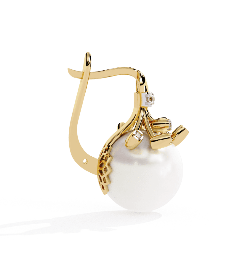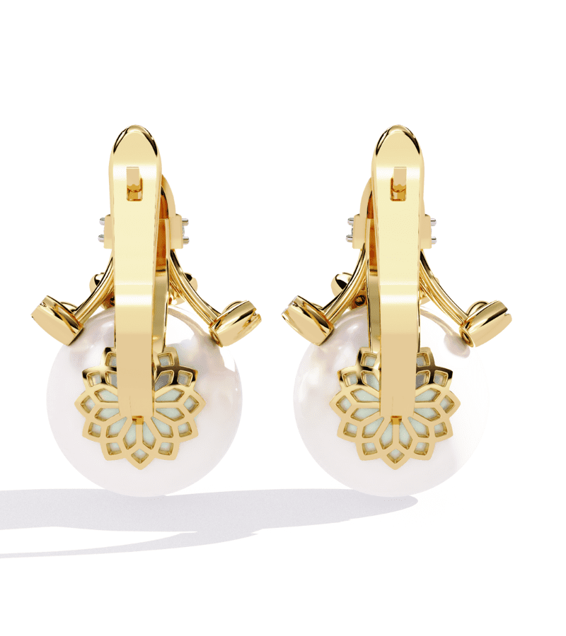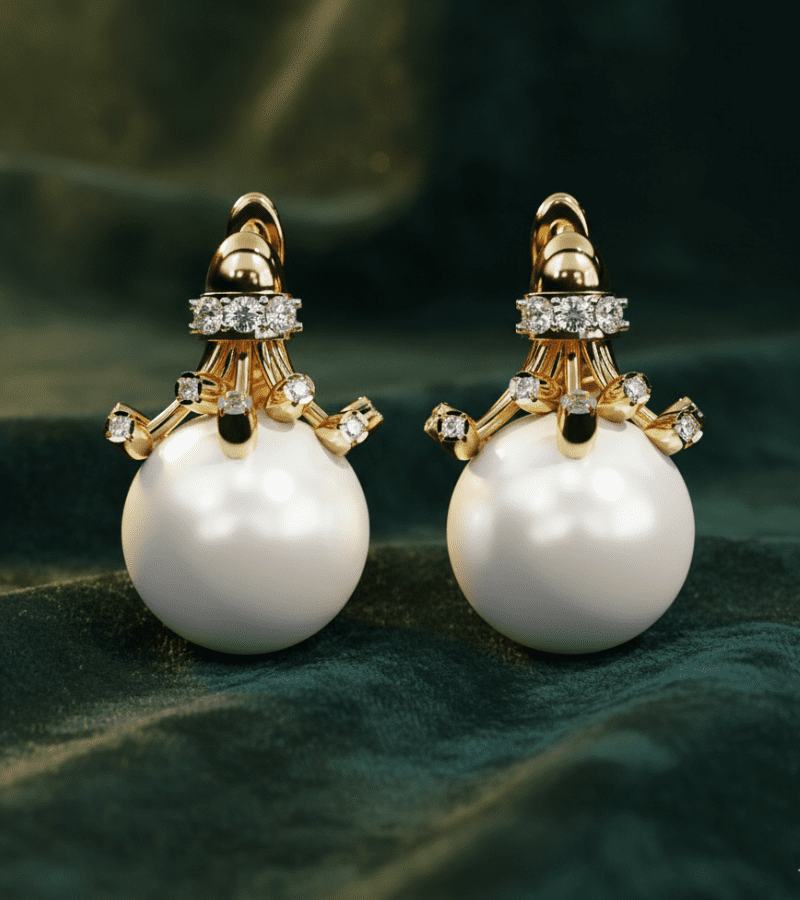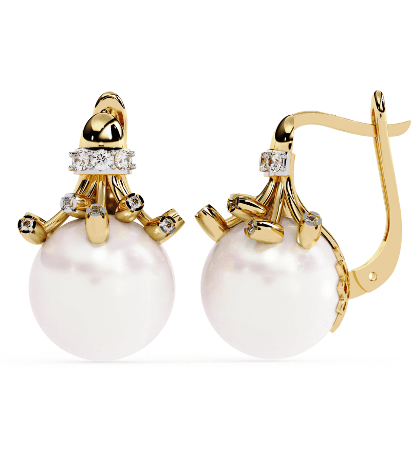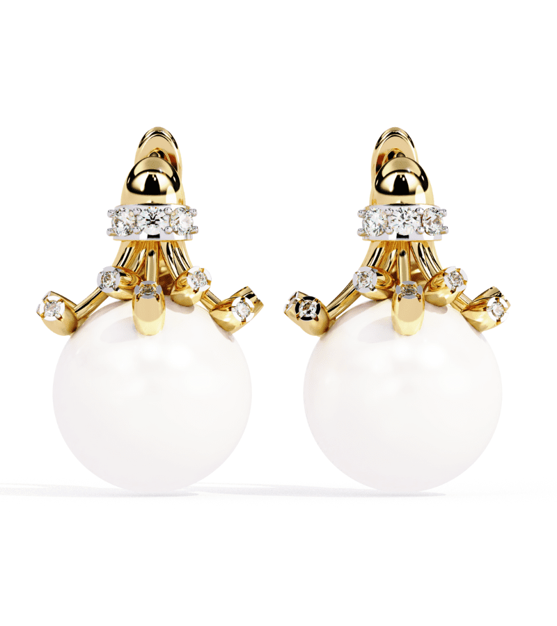 Gold-tone studs featuring a luminous pearl drop crowned with diamond accents and star-inspired details.- Design: ornate crown-like structure in warm gold atop a large, smooth pearl drop.