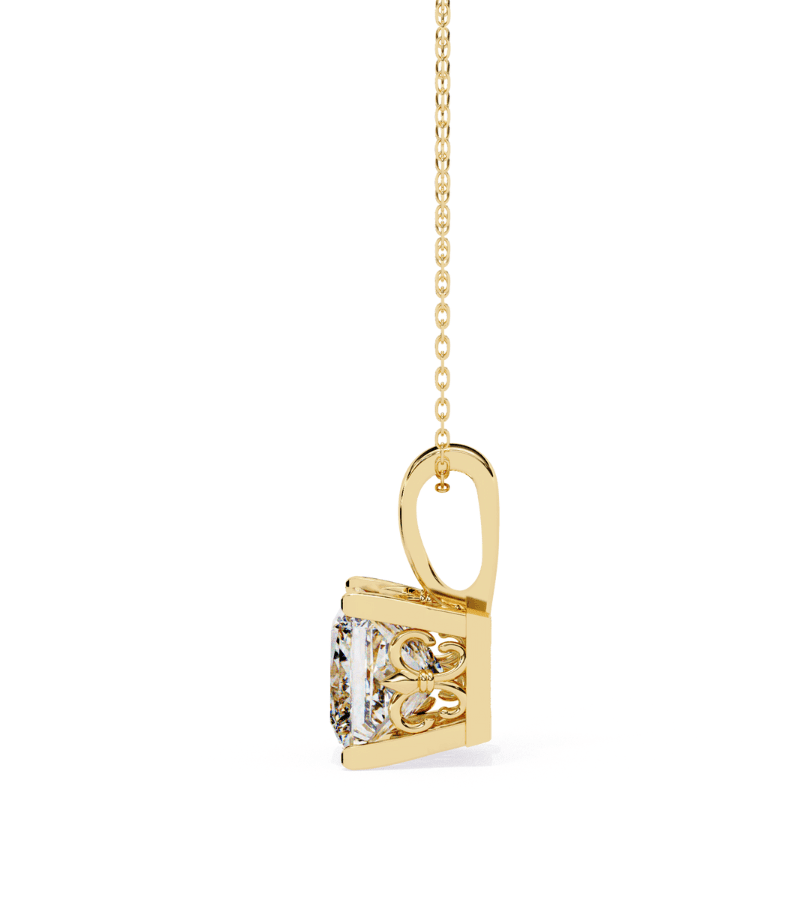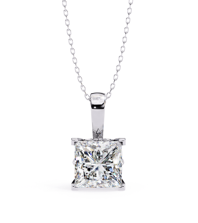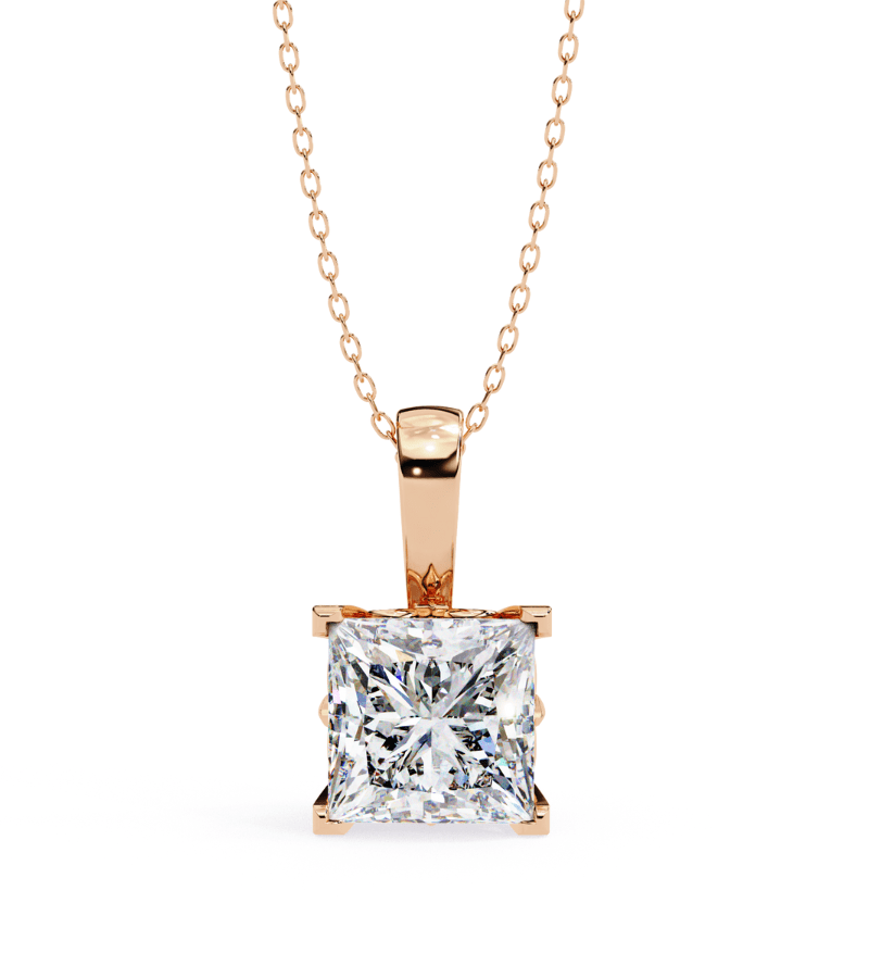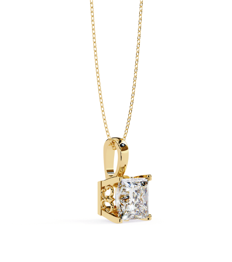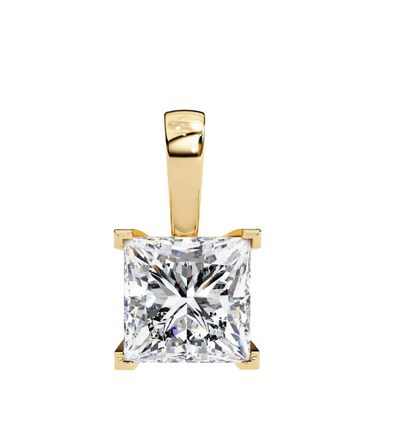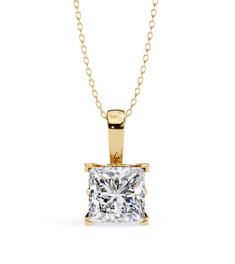 Gold-tone pendant featuring a brilliant square-cut (princess) diamond-style stone in a four-prong setting, suspended from a delicate gold chain