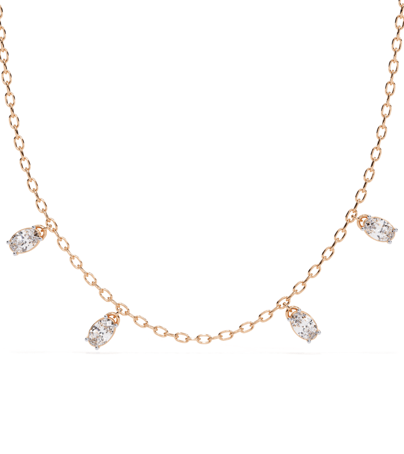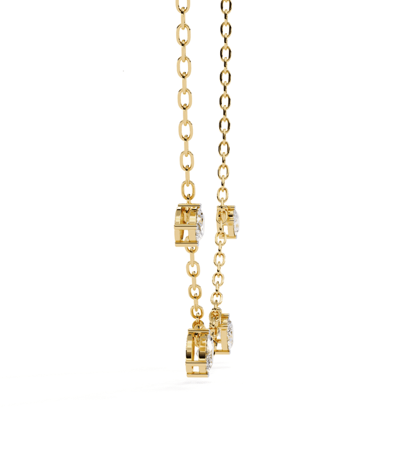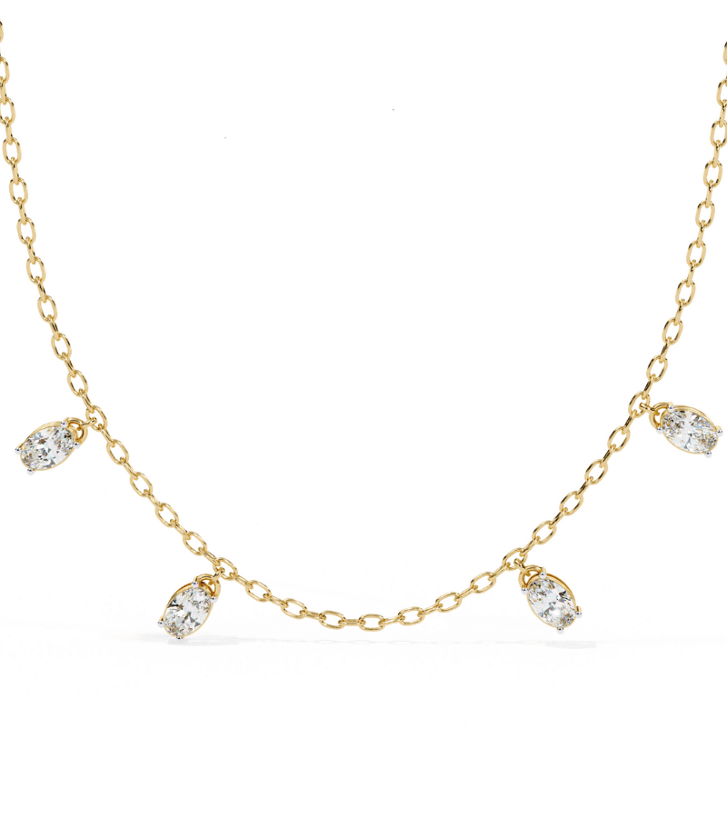 This necklace features a refined gold-tone chain adorned with four marquise-cut diamond drops that float along the length of the necklace. Each drop is securely set to catch the light from every angle, creating a gentle shower-like sparkle against the skin. The evenly spaced droplets create a balanced, graceful silhouette that sits softly at the collarbone, making it a versatile piece suitable for both everyday wear and special occasions. A timeless, luminous accessory that pairs beautifully with other jewelry or a simple neckline.