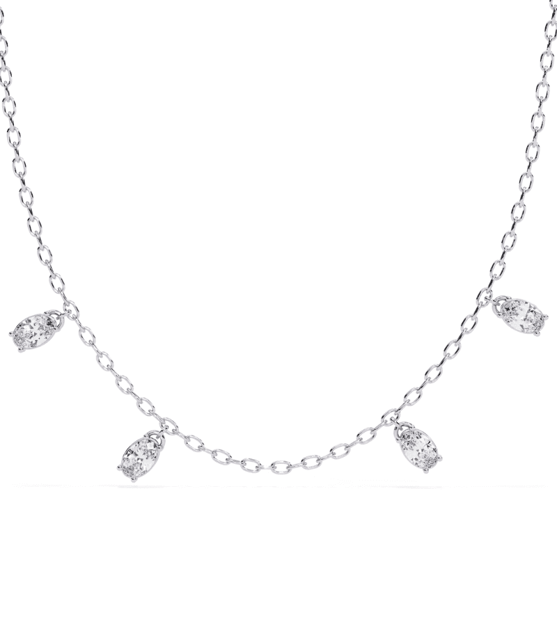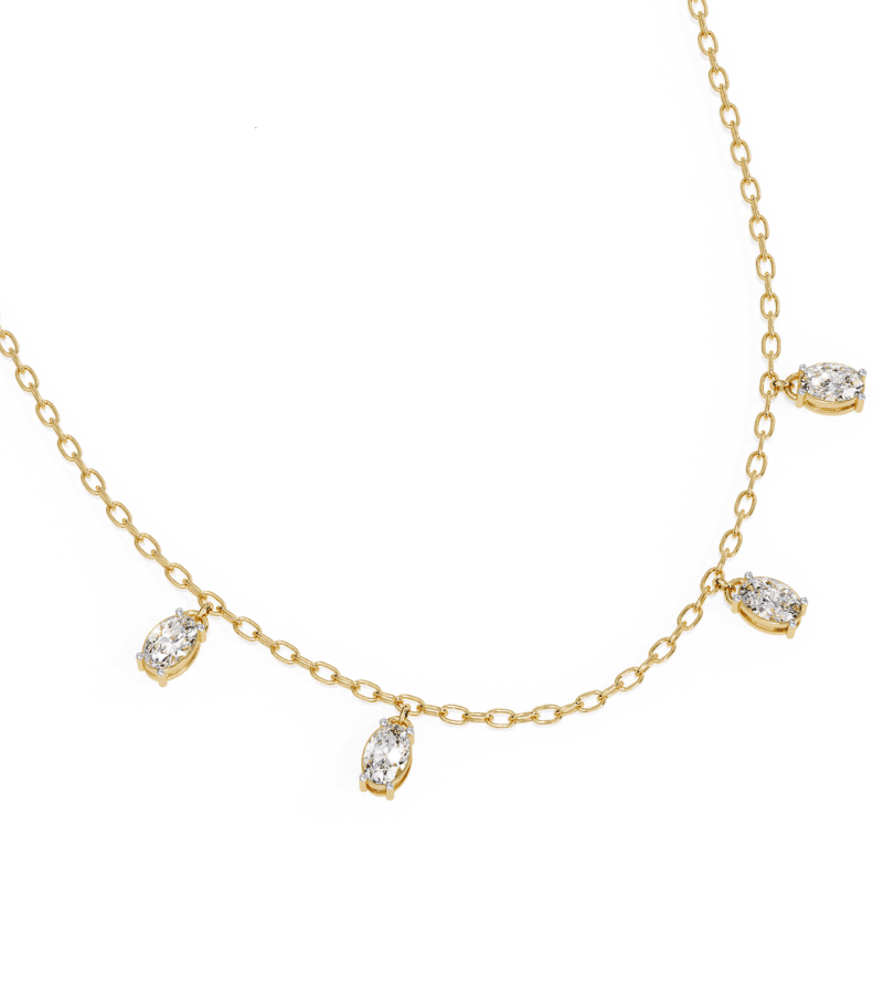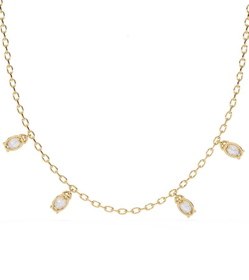 - Design: slender gold chain with evenly spaced marquise diamond drops.