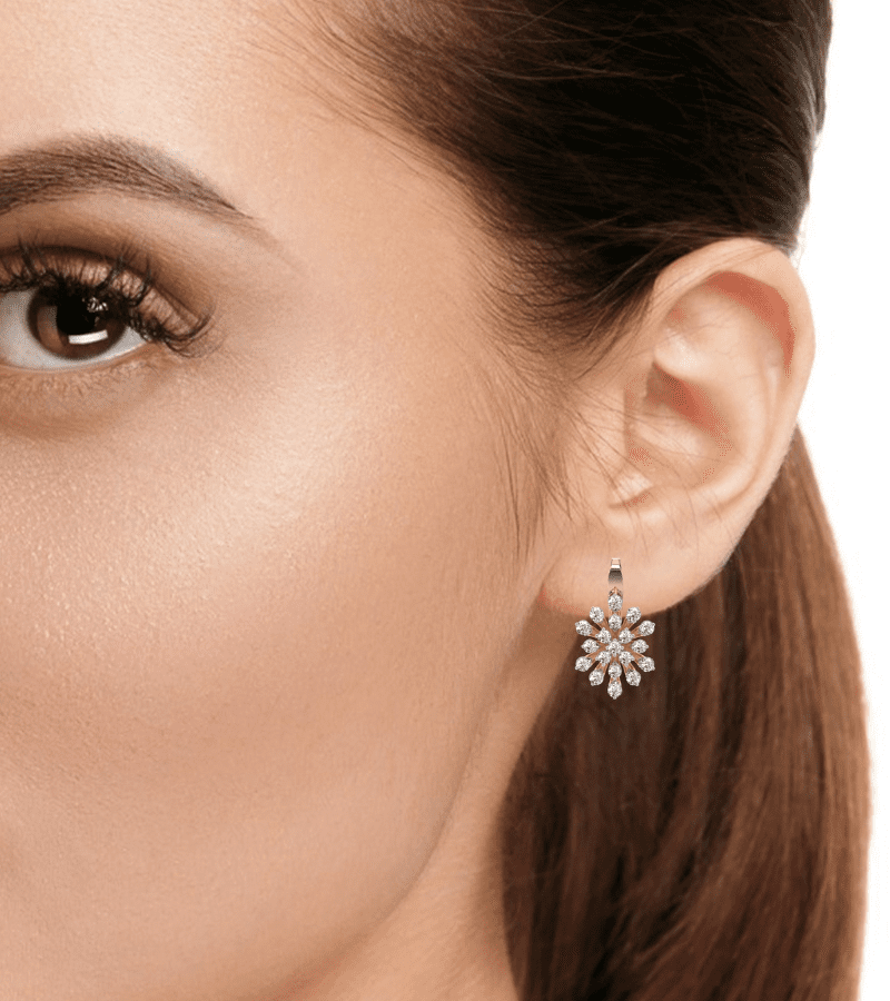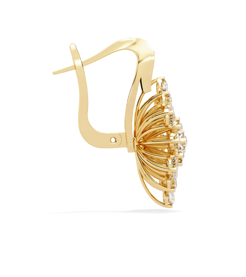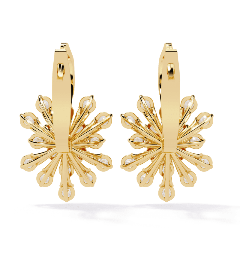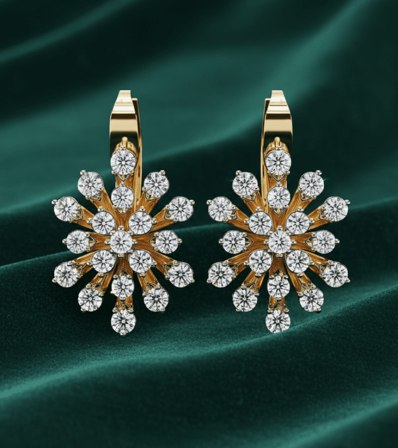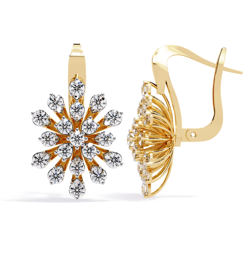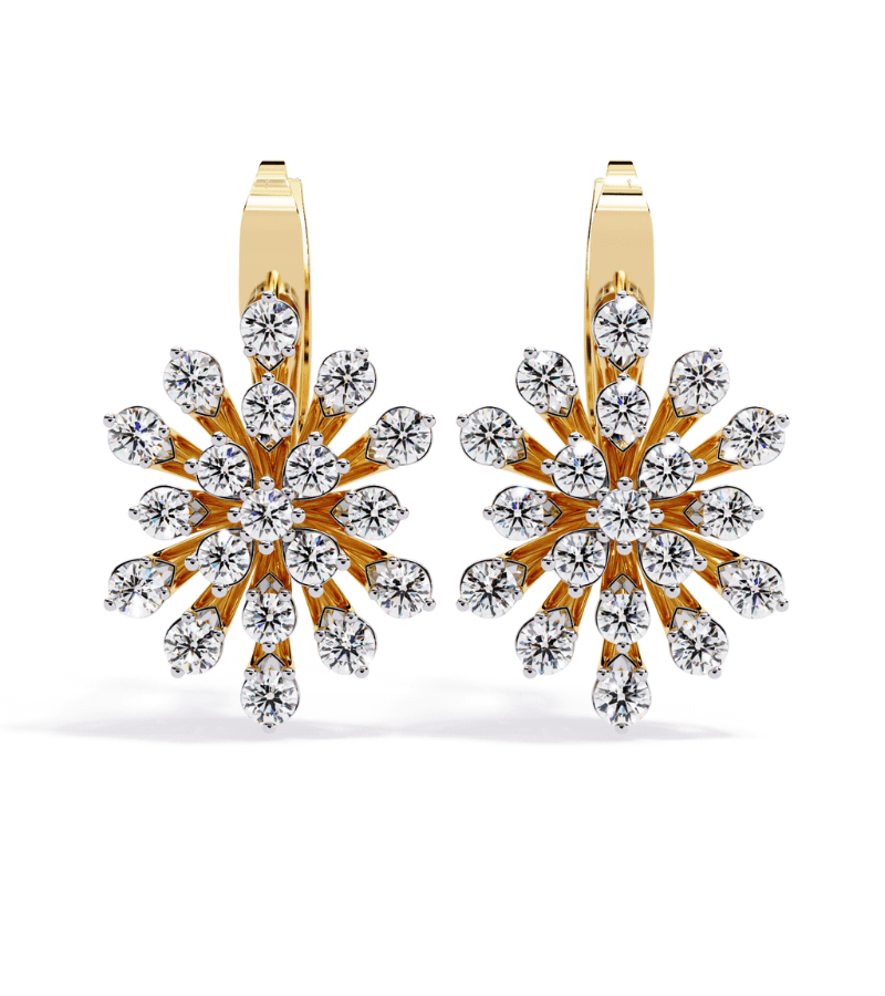 Gold-tone snowflake-inspired stud earrings set with radiant round diamonds.- Design: intricate starburst/snowflake motif with multiple diamond “arms” extending outward.
