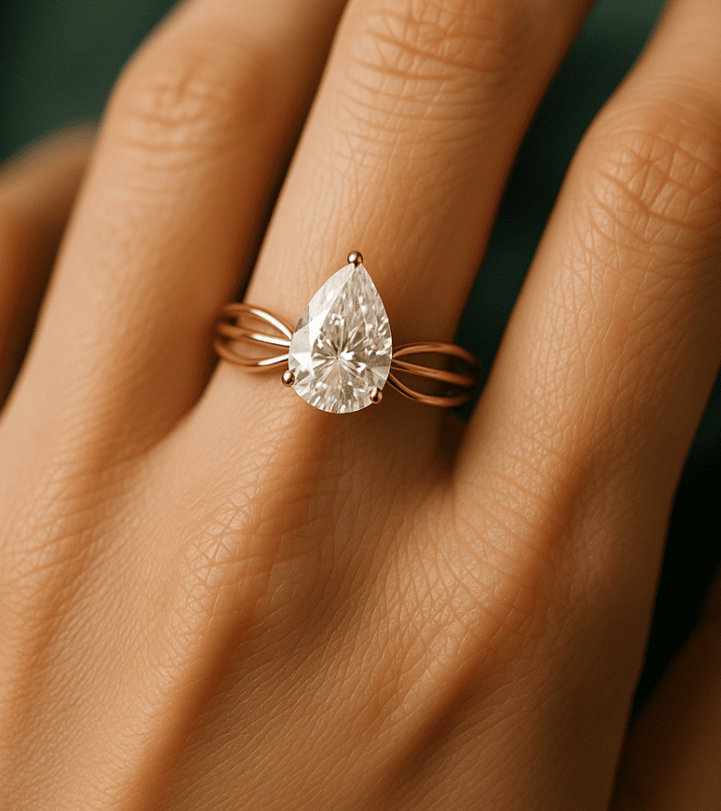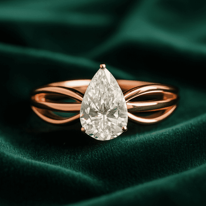 Rose-gold band featuring a pear-cut diamond centerpiece that sits gracefully atop a slender, sculpted band.